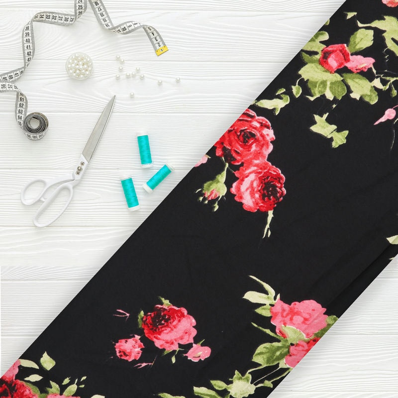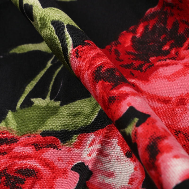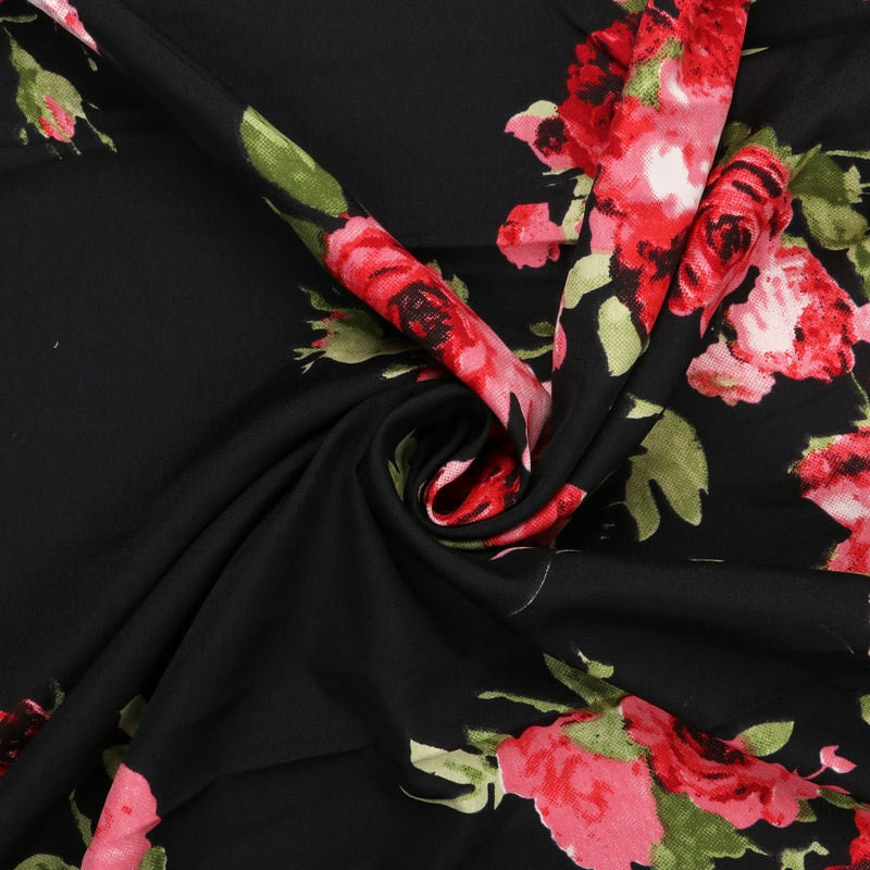 Black And Red Floral Pattern Screen Print Micro Crepe Fabric