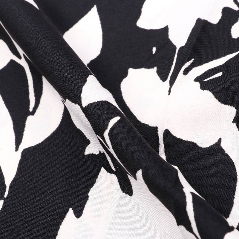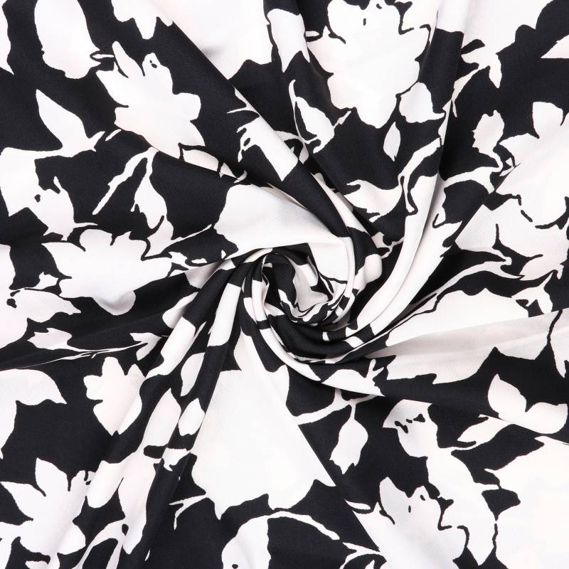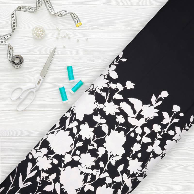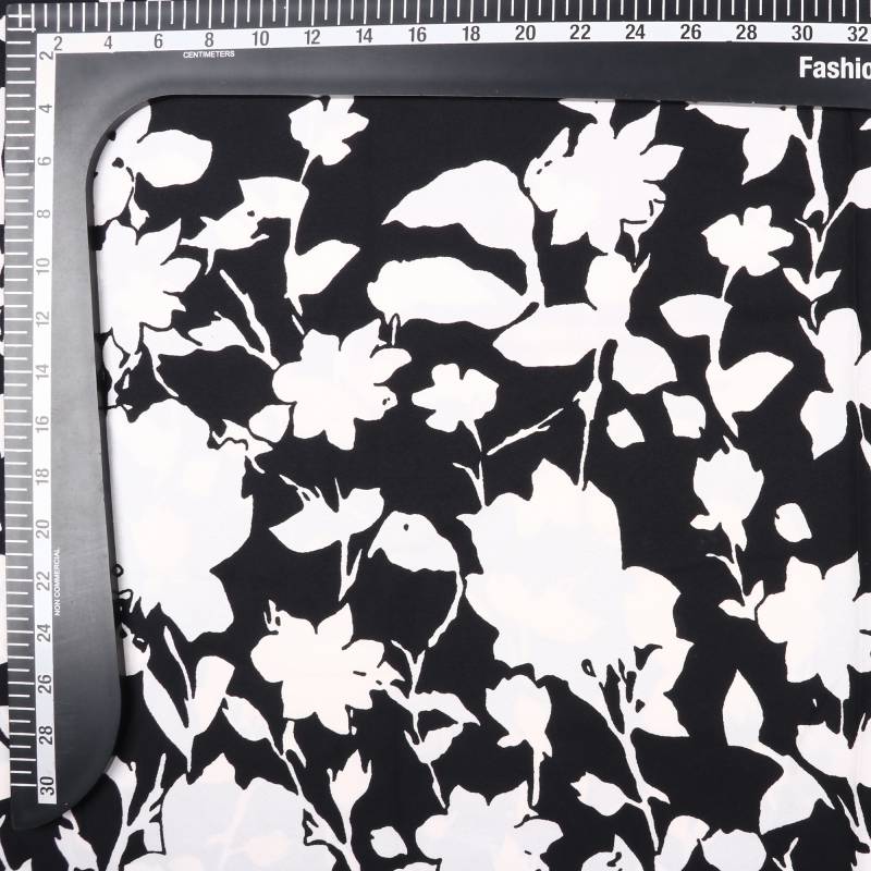 Black And White Floral Pattern Screen Print Micro Crepe Fabric