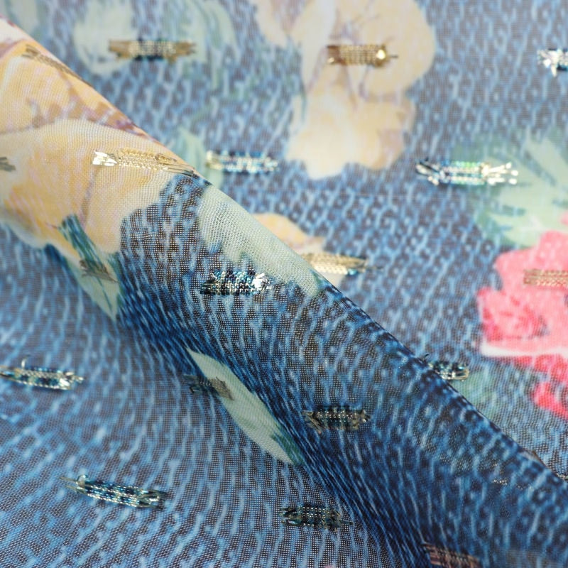 Blue And Pink Floral Pattern Digital Print Chiffon Golden Dobby Fabric