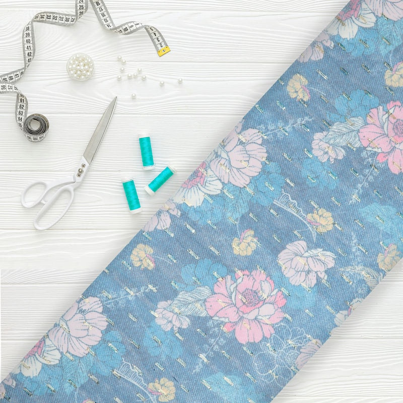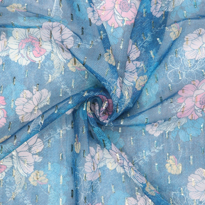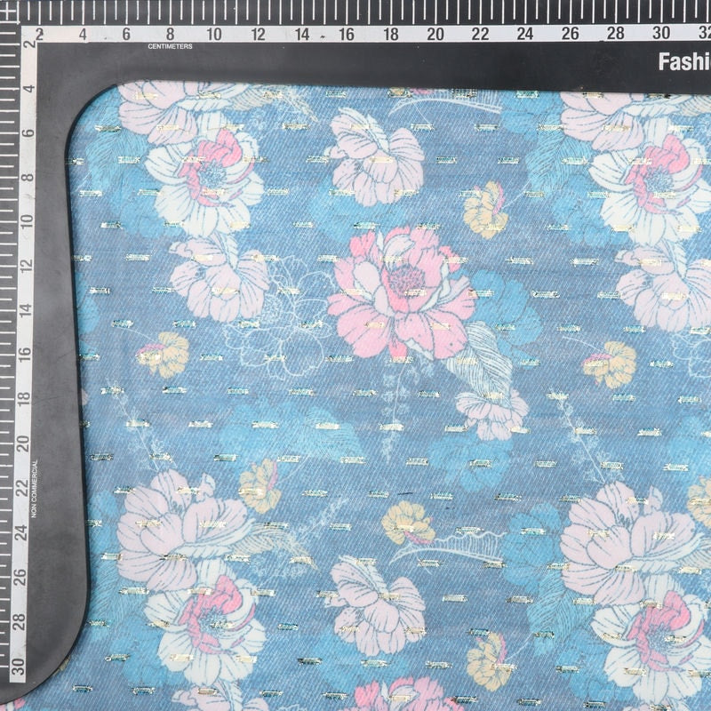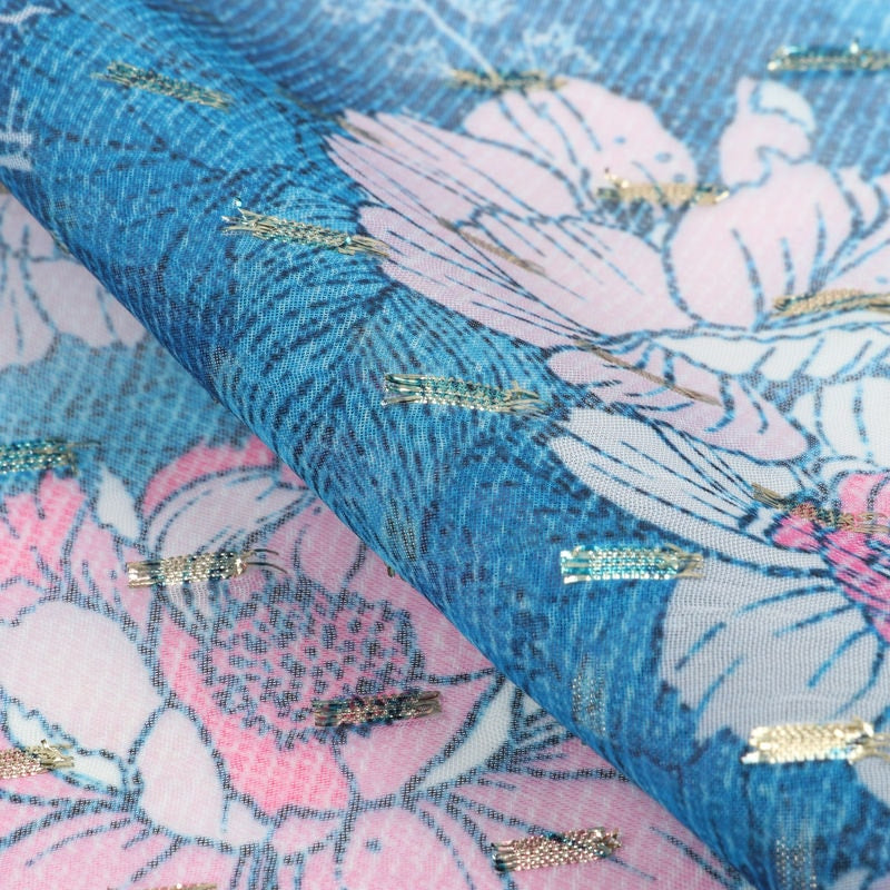 Blue And Pink Floral Pattern Digital Print Chiffon Golden Dobby Fabric