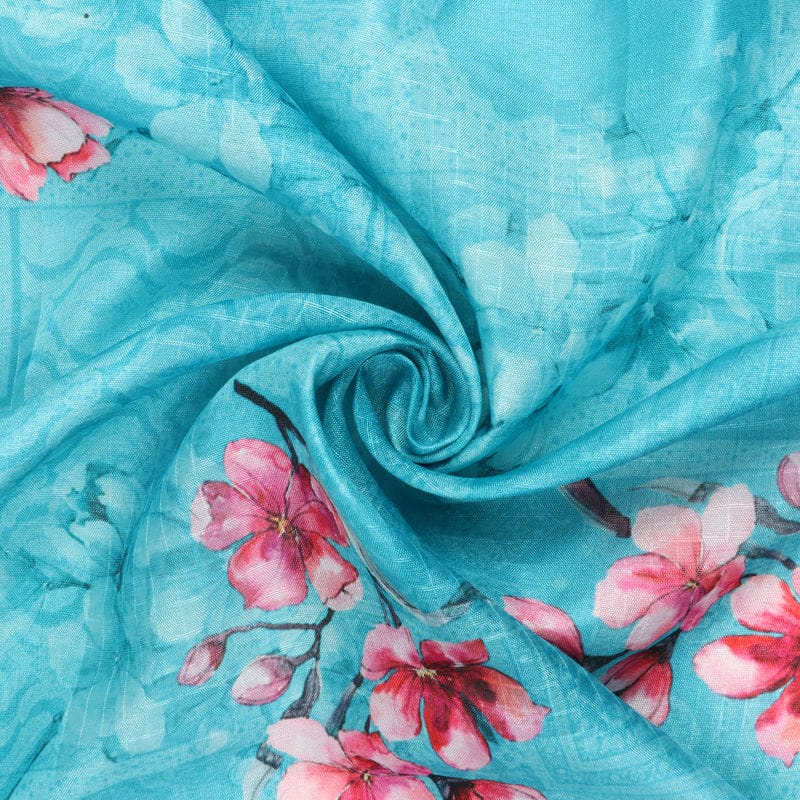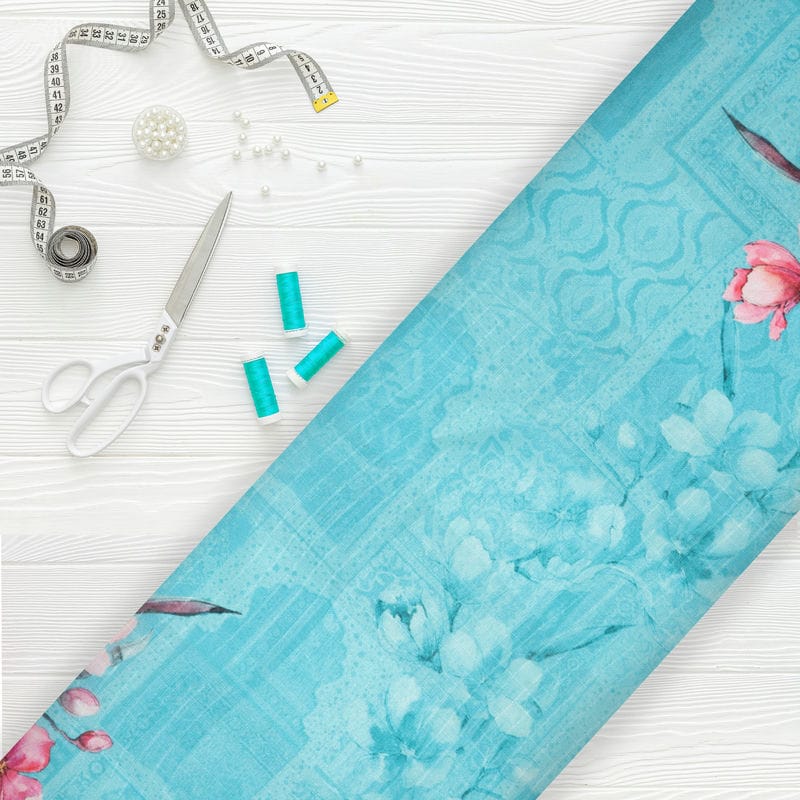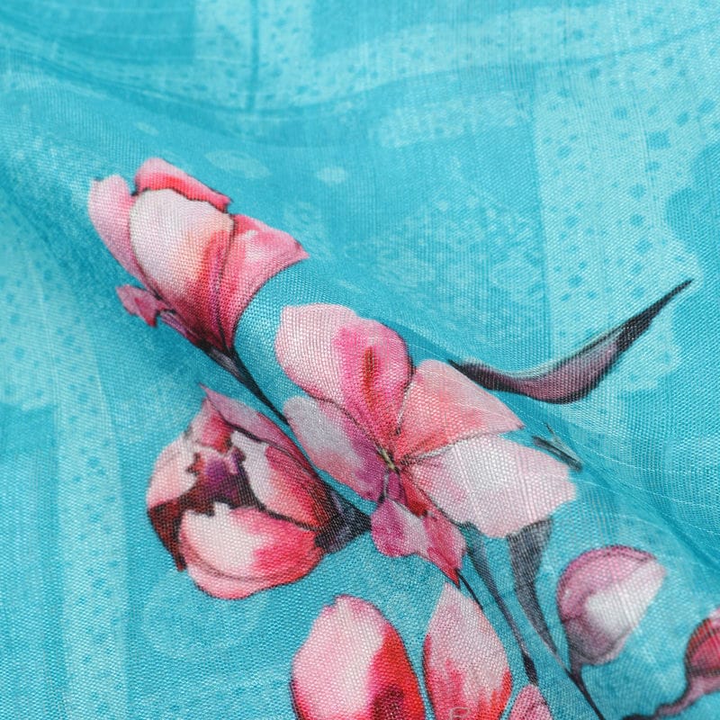 Blue And Pink Floral Pattern Digital Print Tangy Silk Checks Fabric