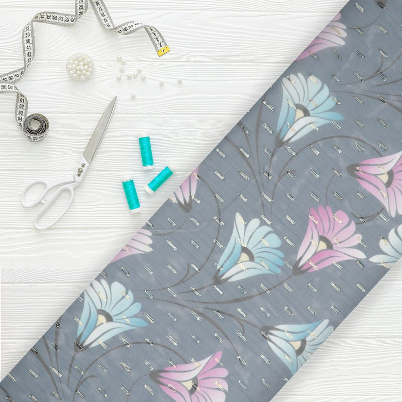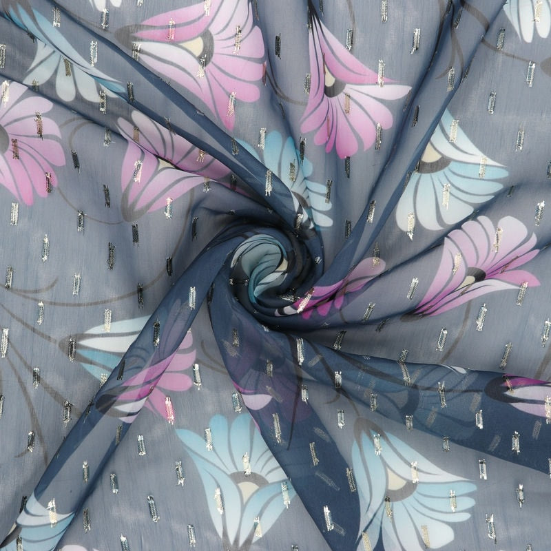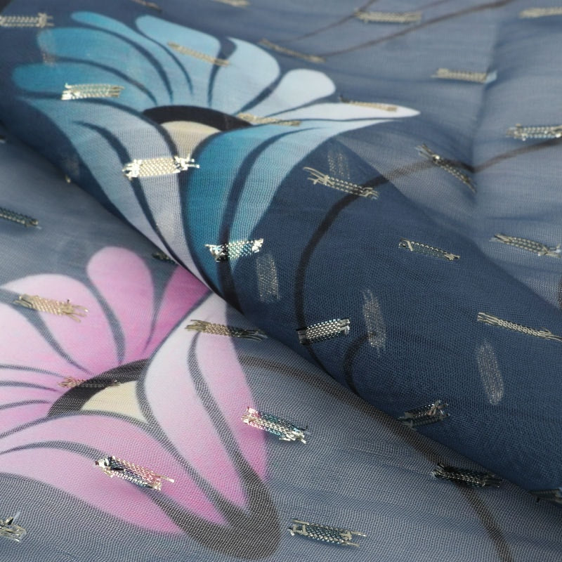 Blue And Purple Floral Pattern Digital Print Chiffon Golden Dobby Fabric