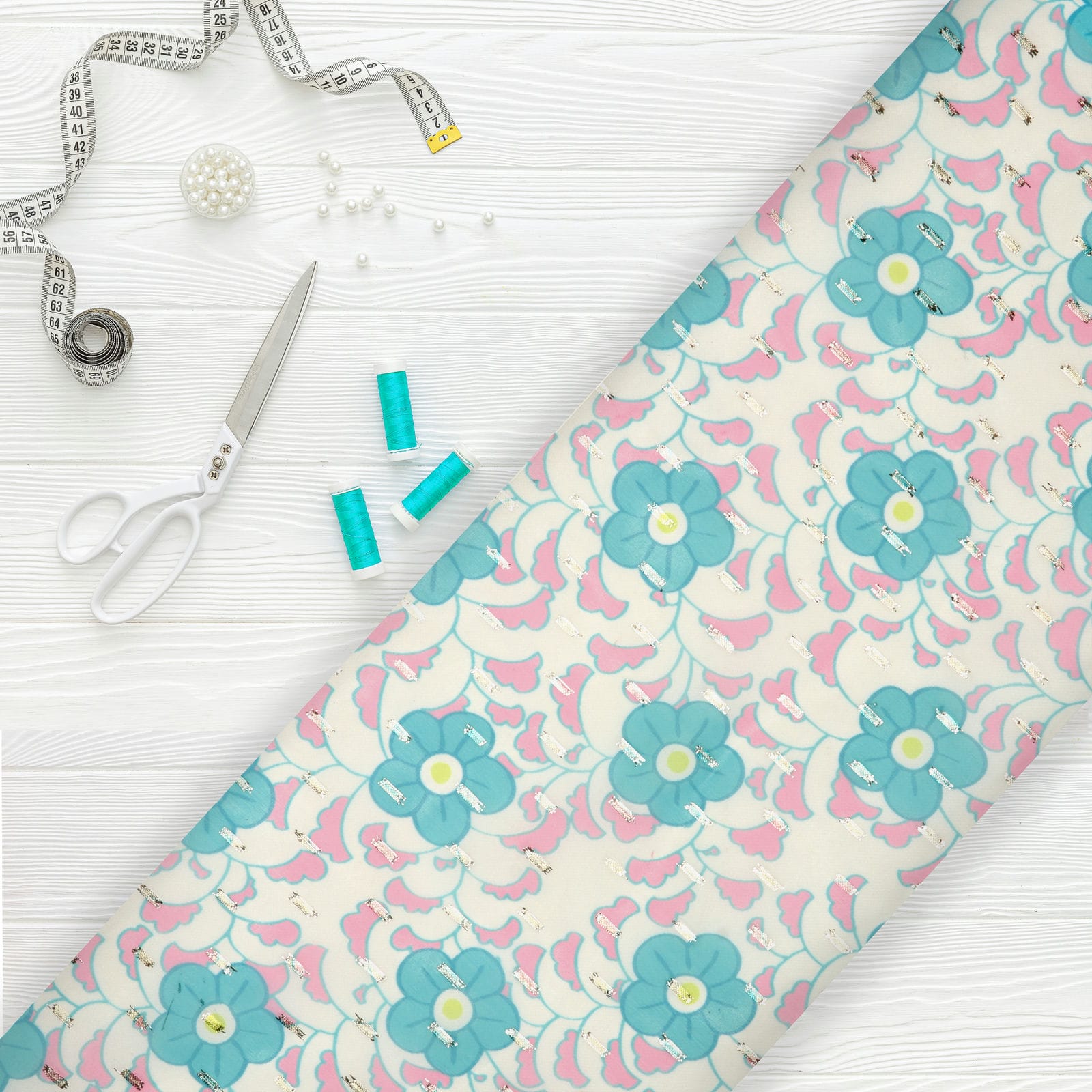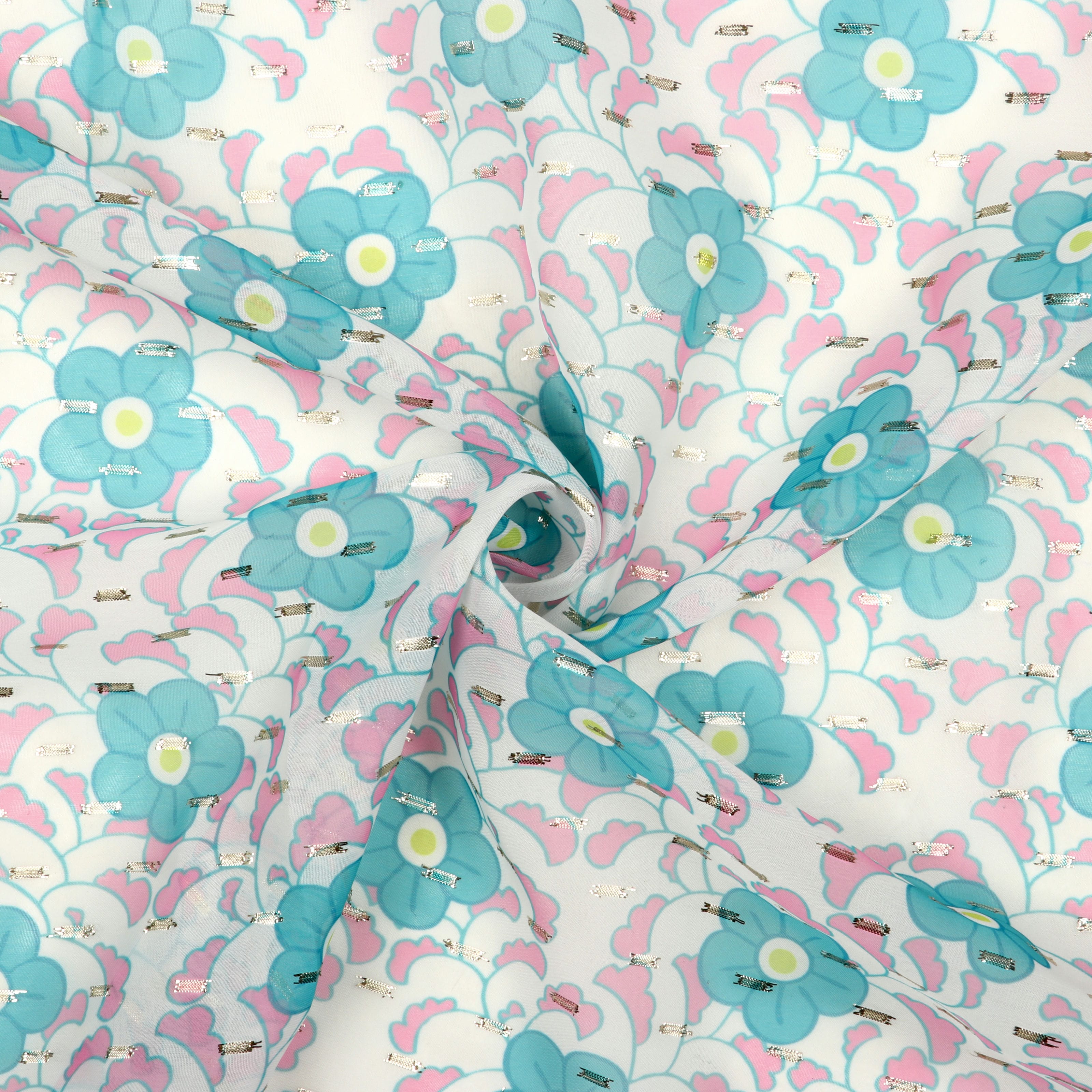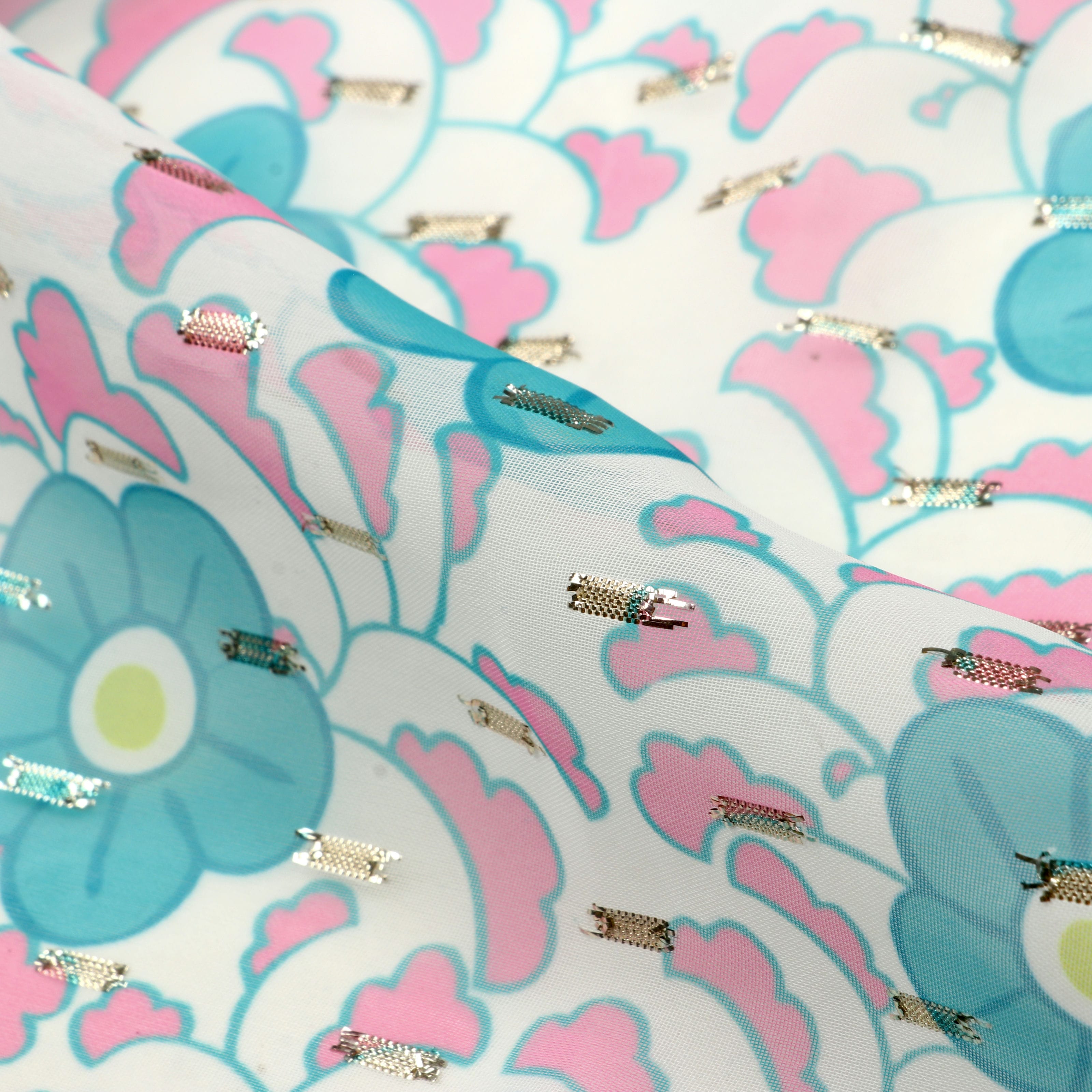 Blue Turquoise and White Floral Digital Print Chiffon Fabric with Golden Zari Dobby