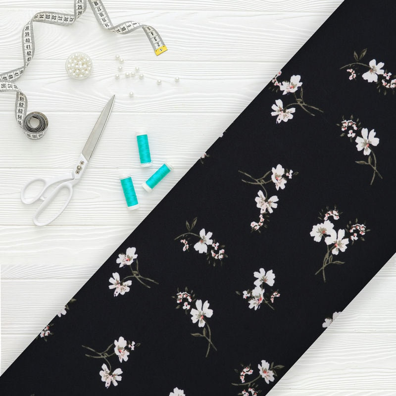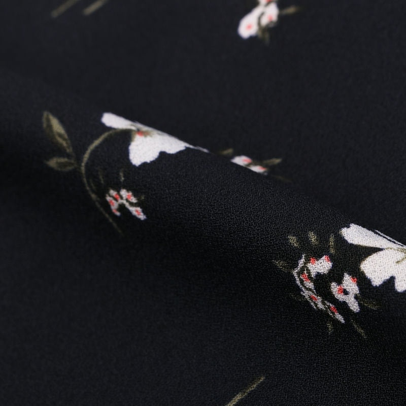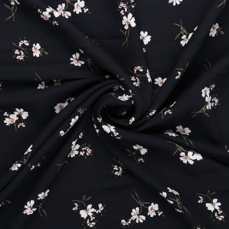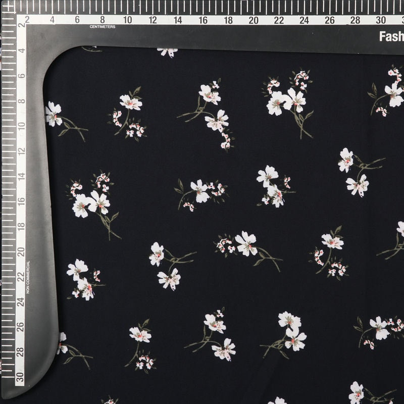 Dark Blue And White Floral Pattern Screen Print Moss Crepe Fabric