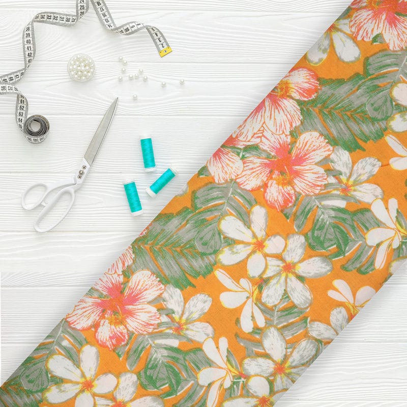 Dark Orange And White Floral Pattern Screen Print Rayon Fabric