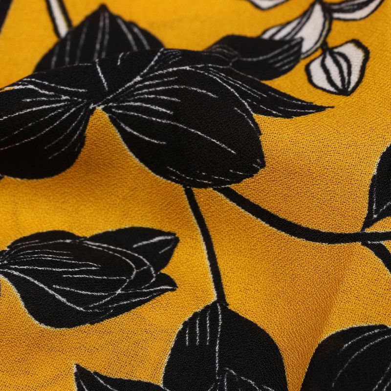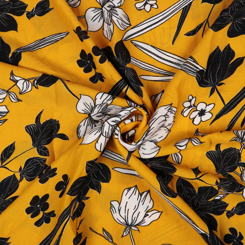 Dark Yellow And Black Floral Pattern Screen Print Moss Crepe Fabric