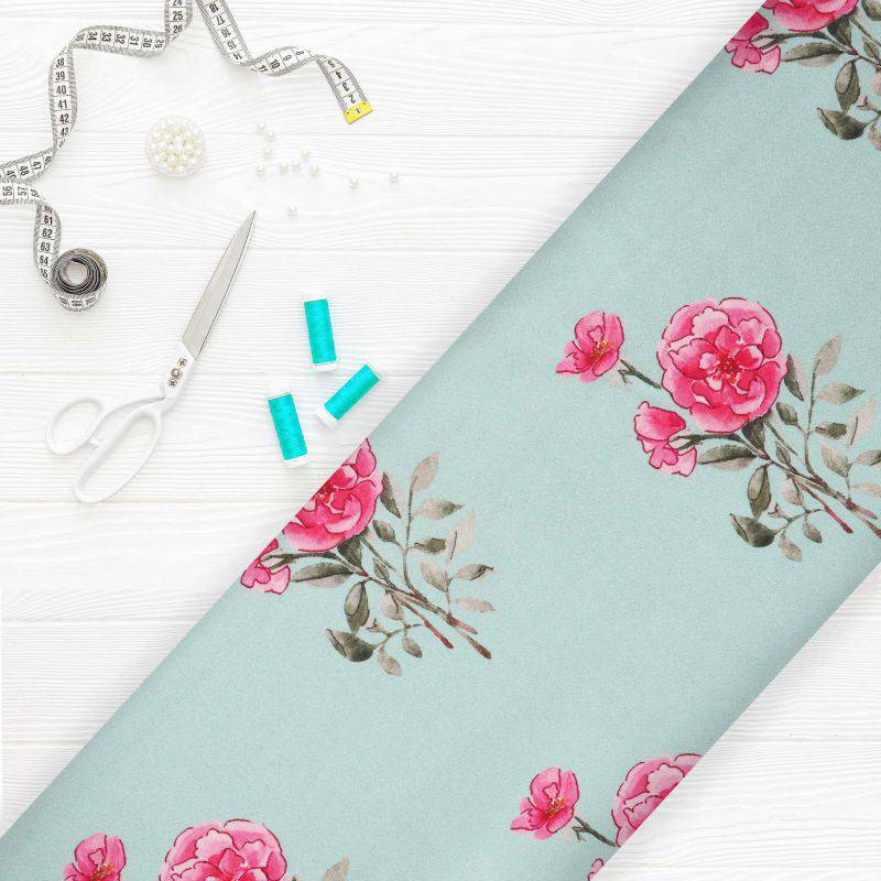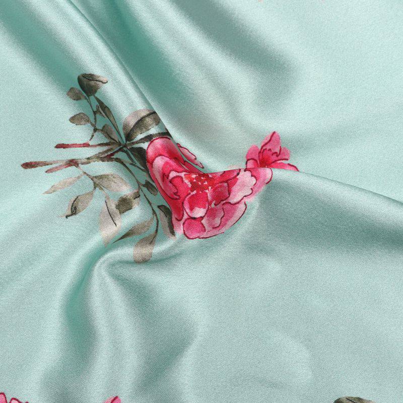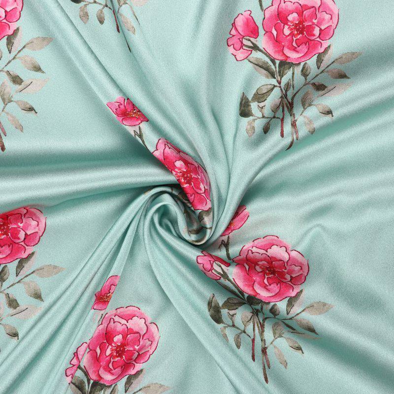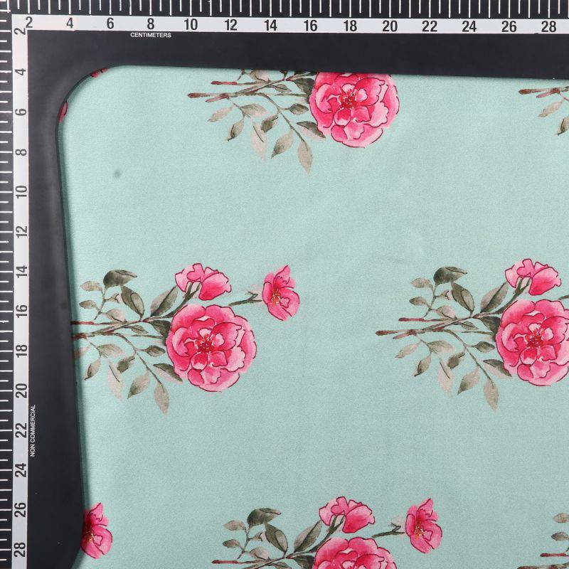 Dusty Green And Bright Pink Floral Pattern Digital Print Japan Satin Fabric