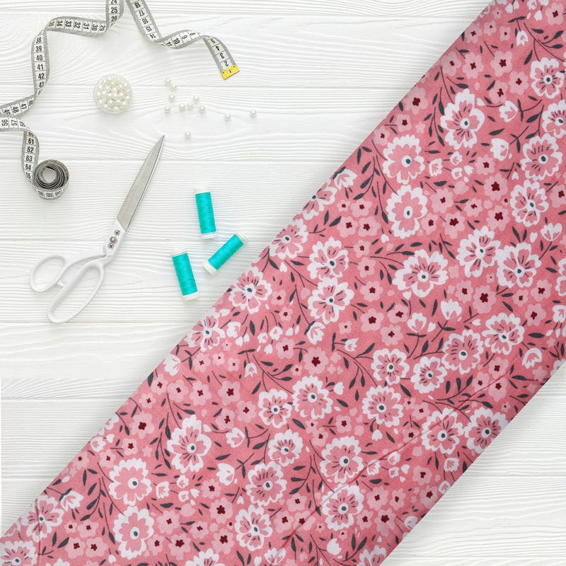 Dusty Red And White Floral Pattern Screen Print Rayon Fabric