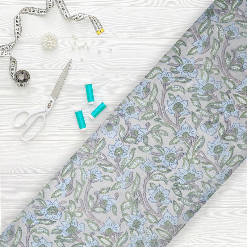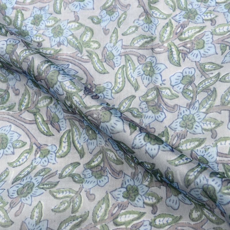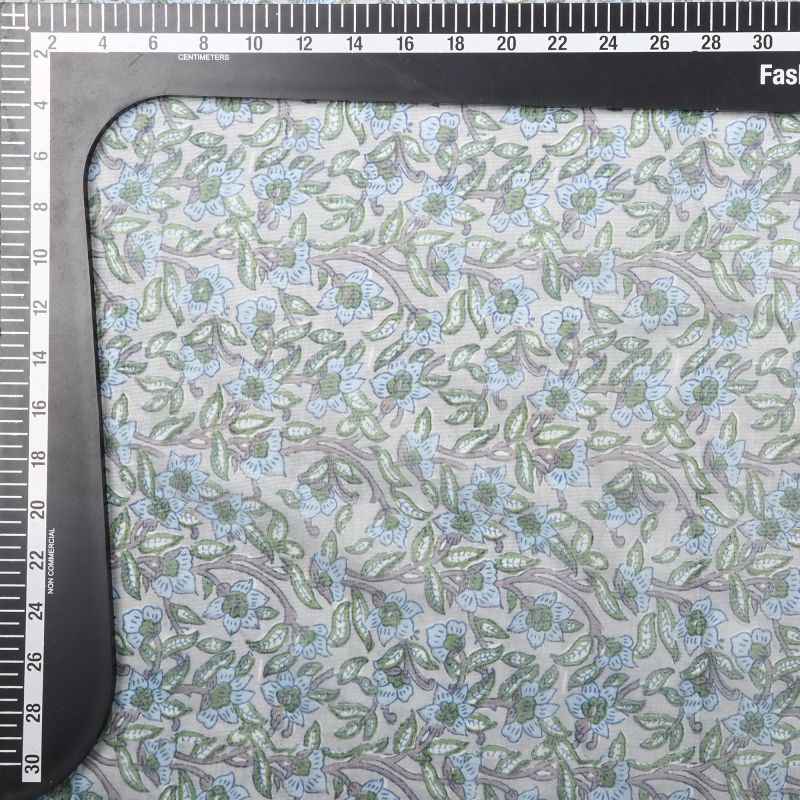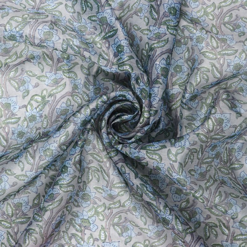 Forest Green And Sky Blue Floral Pattern Digital Print Chanderi Fabric