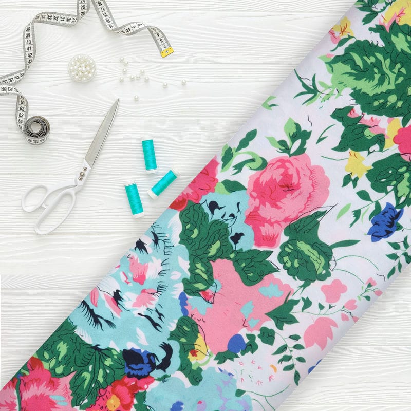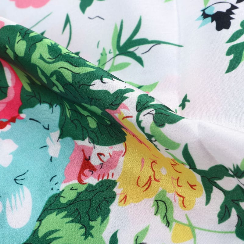 Green And White Floral Pattern Digital Print Japan Satin Fabric