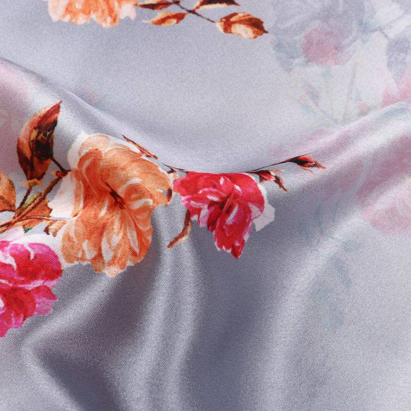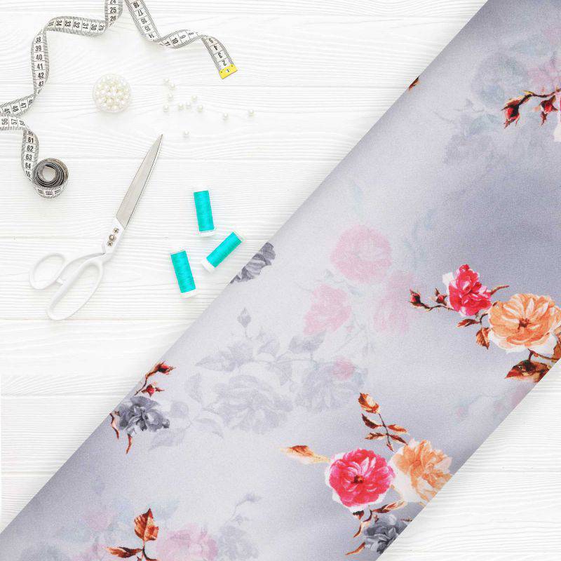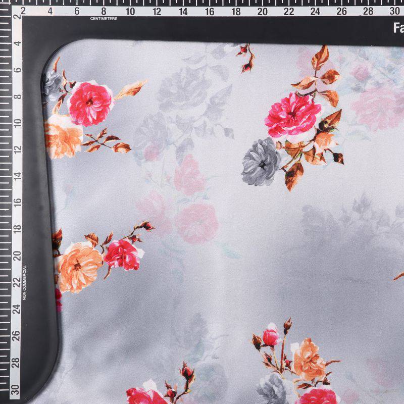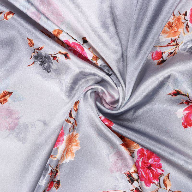 Grey And Pink Floral Pattern Digital Print Japan Satin Fabric
