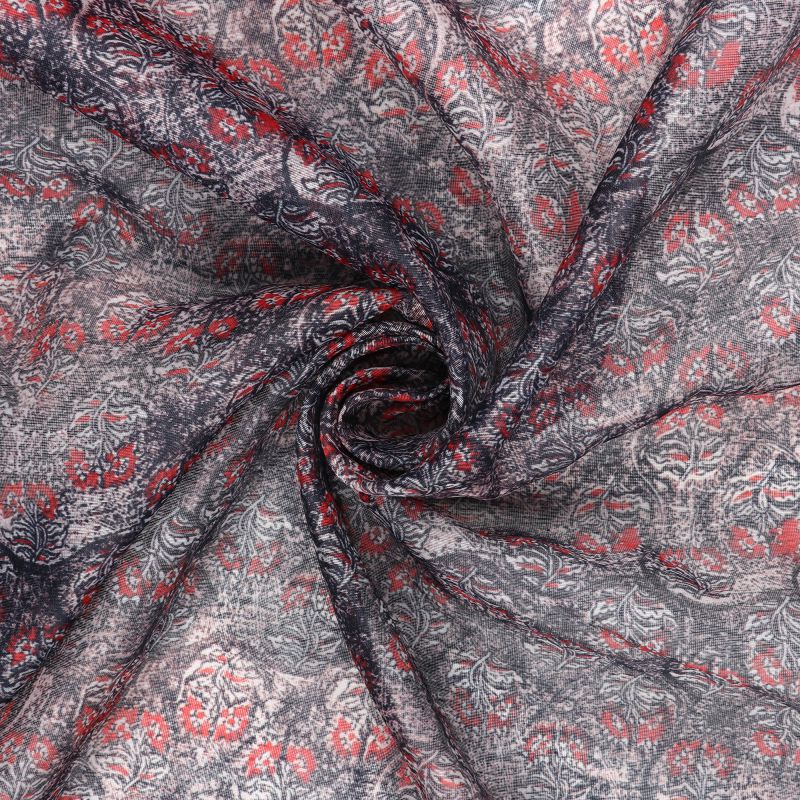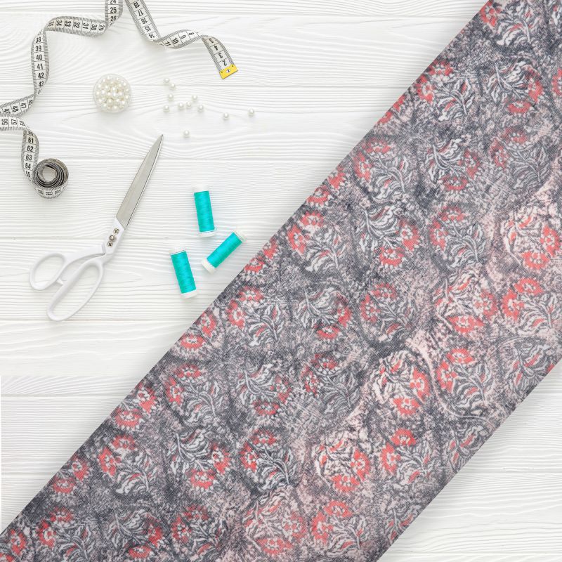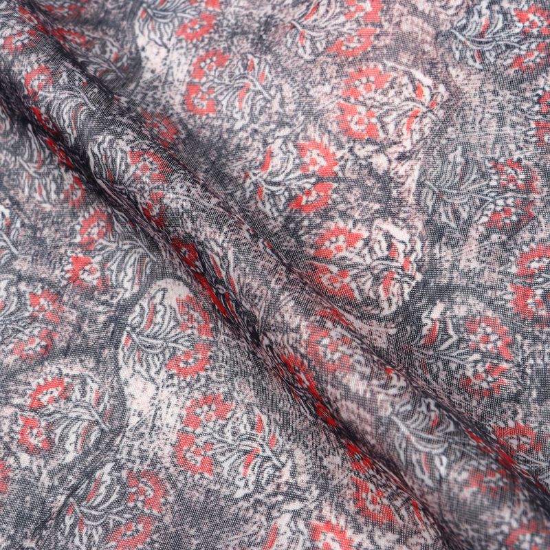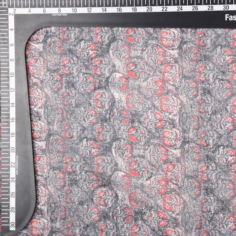 Grey And Red Floral Pattern Digital Print Chanderi Fabric