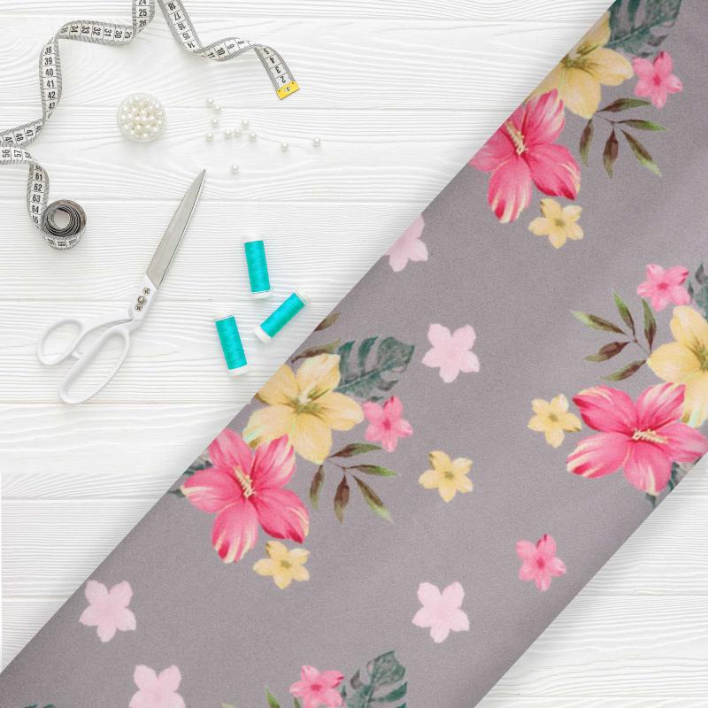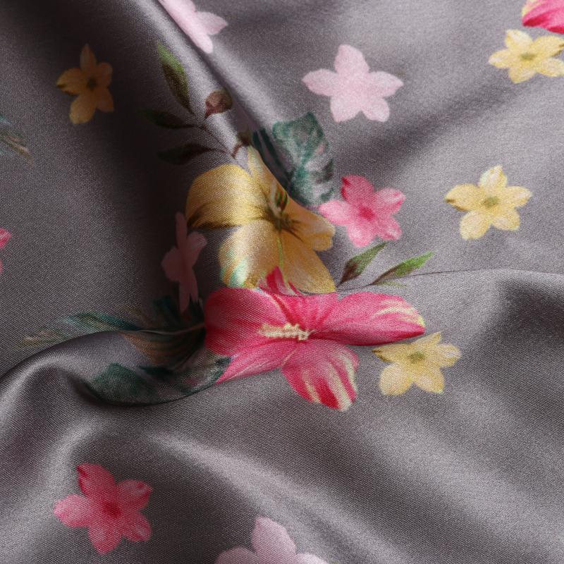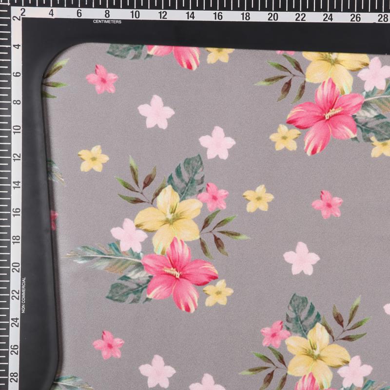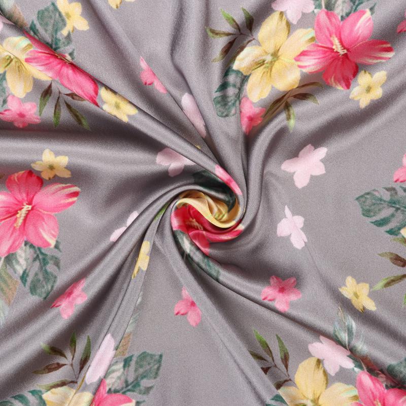 Grey And Yellow Floral Pattern Digital Print Japan Satin Fabric