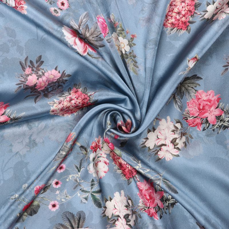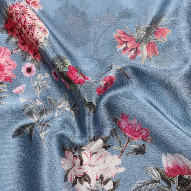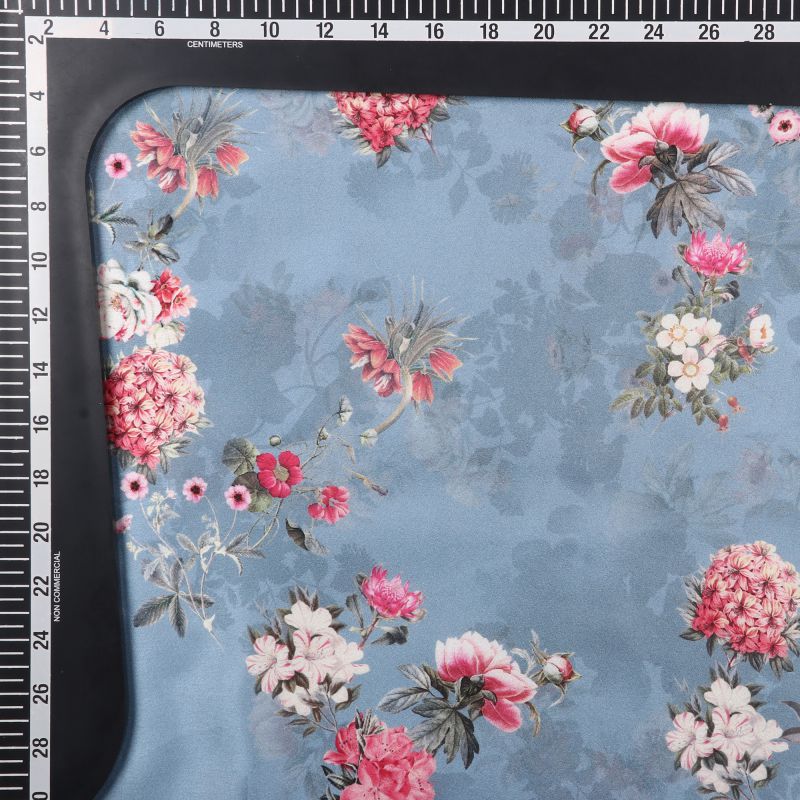 Greyish Blue And Pink Floral Pattern Digital Print Japan Satin Fabric