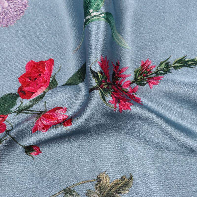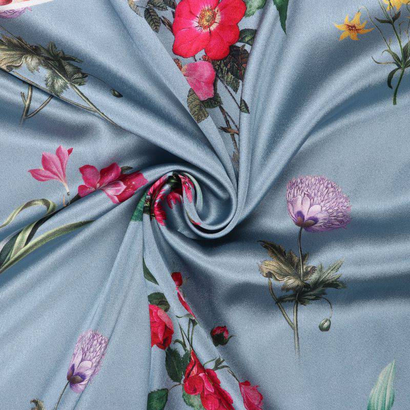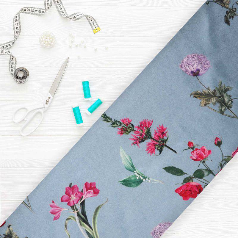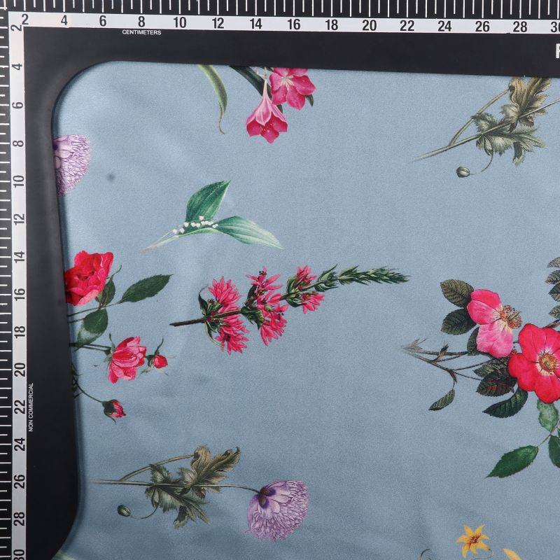 Greyish Blue And Red Floral Pattern Digital Print Japan Satin Fabric