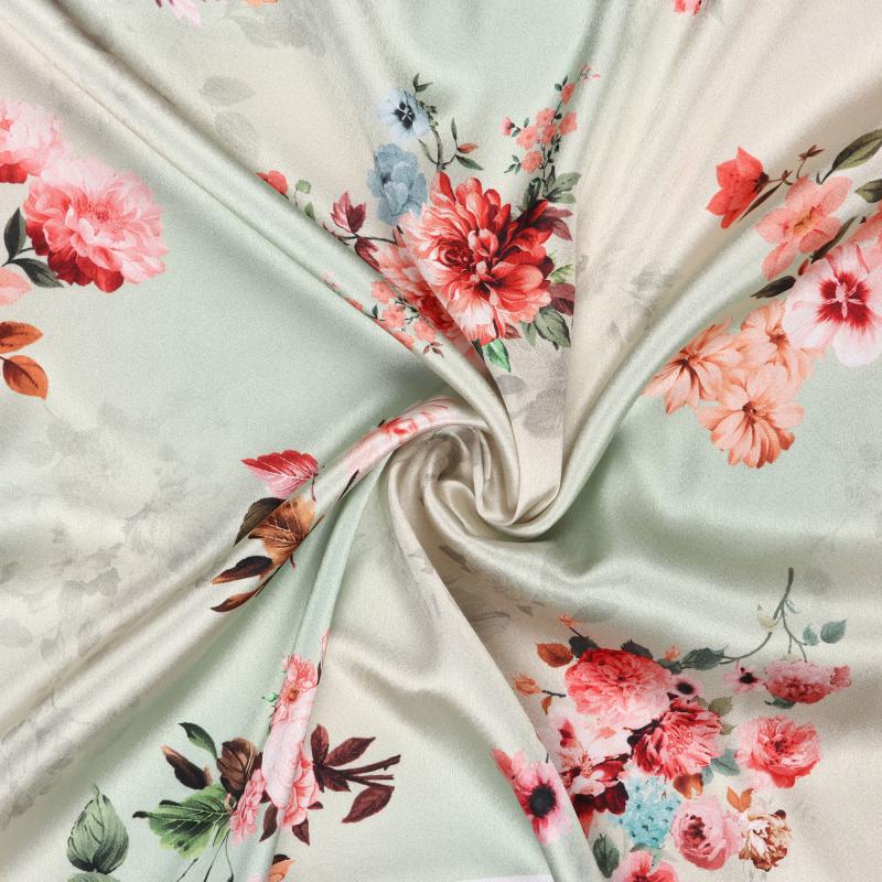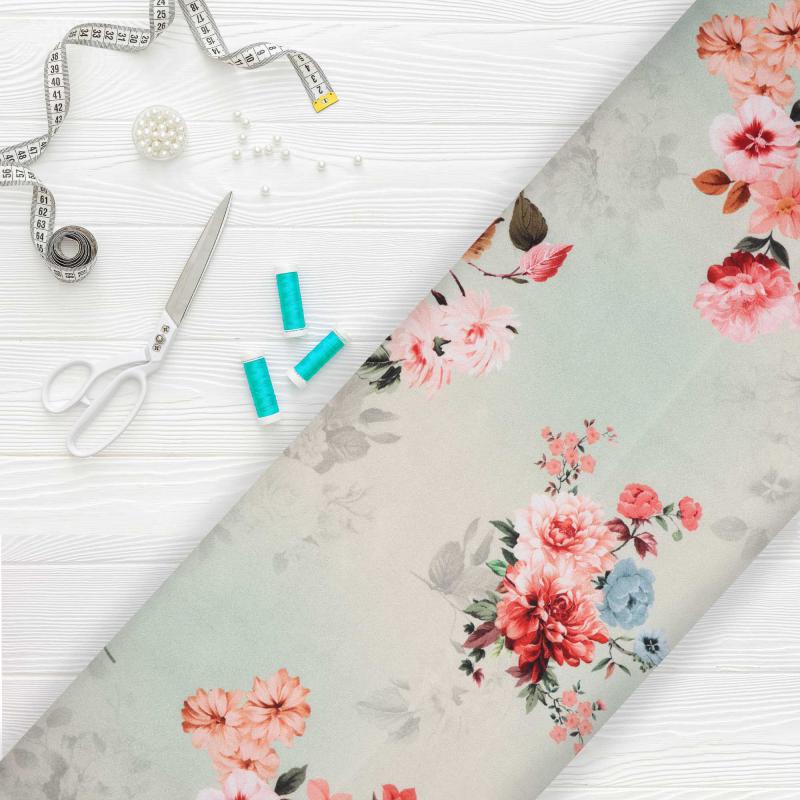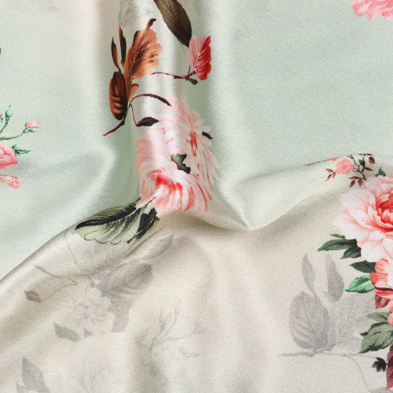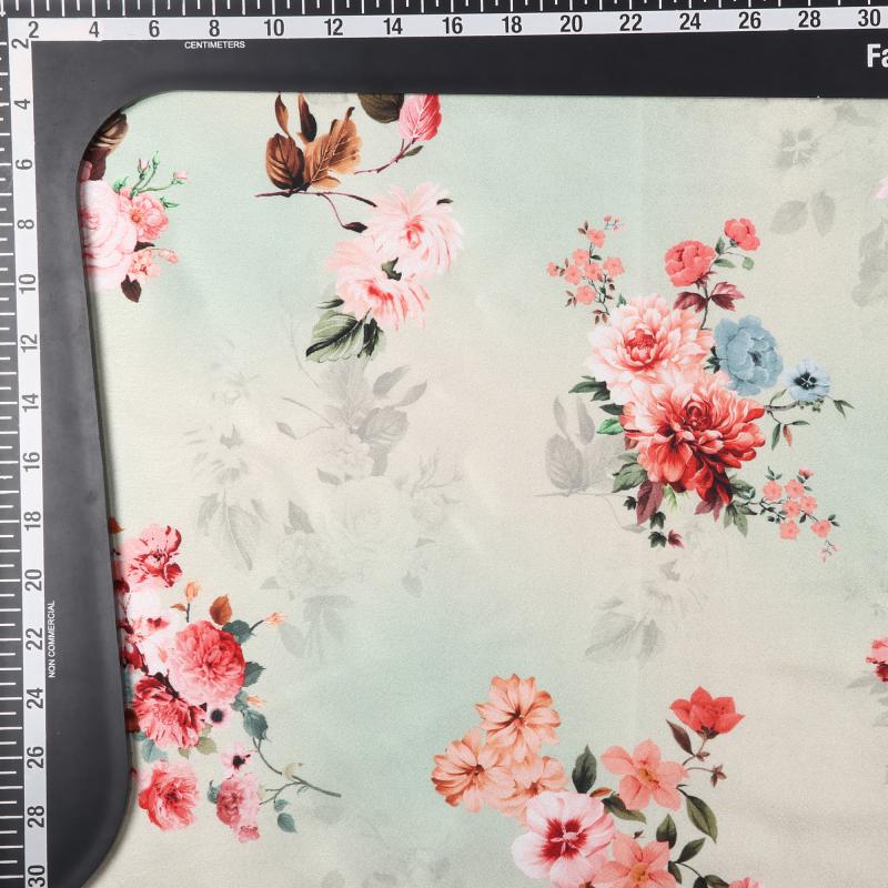 Greyish Green And Pink Floral Pattern Digital Print Japan Satin Fabric