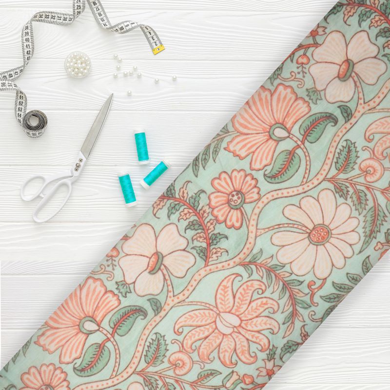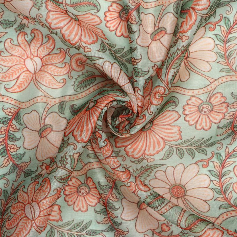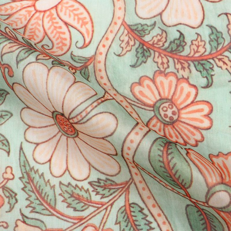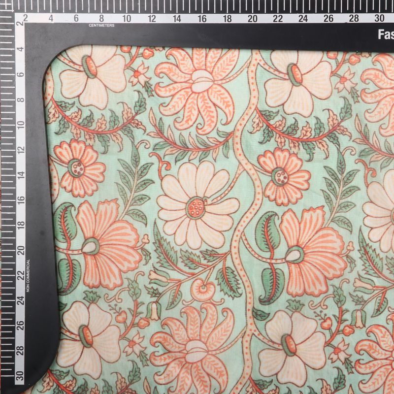 Mint Green And Orange Floral Pattern Digital Print Chanderi Fabric