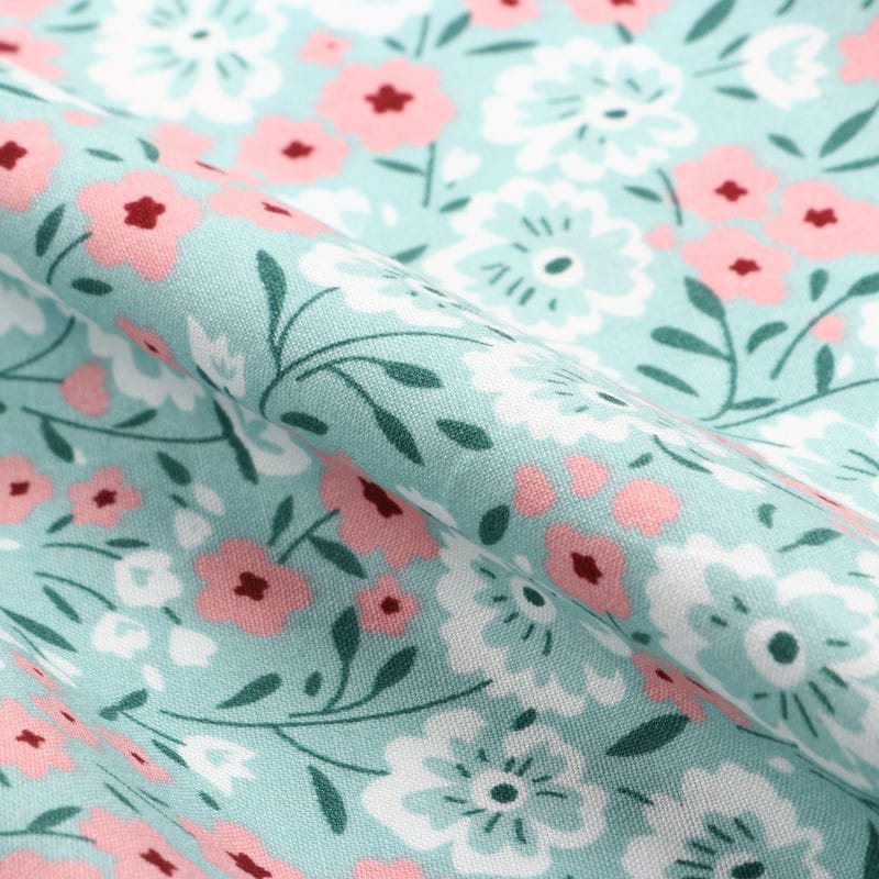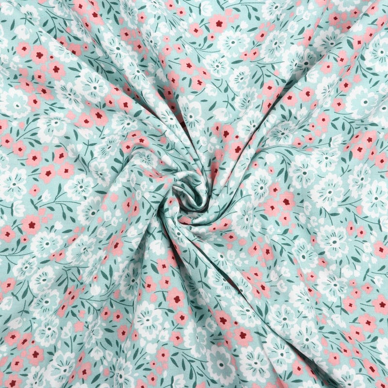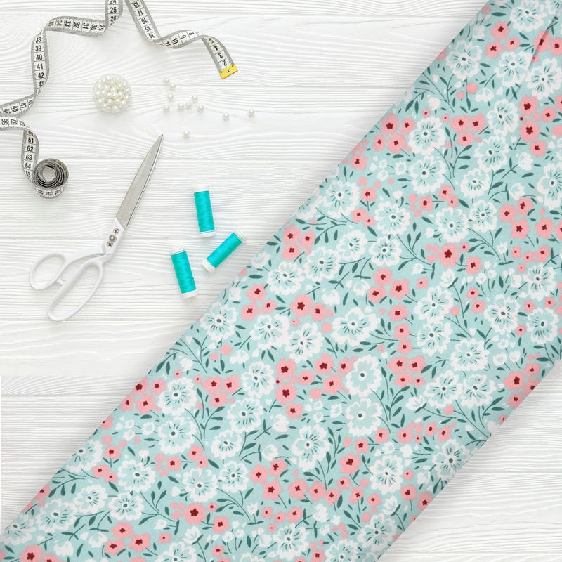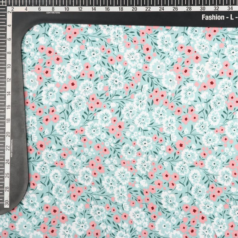 Mint Green And Red Floral Pattern Screen Print Rayon Fabric