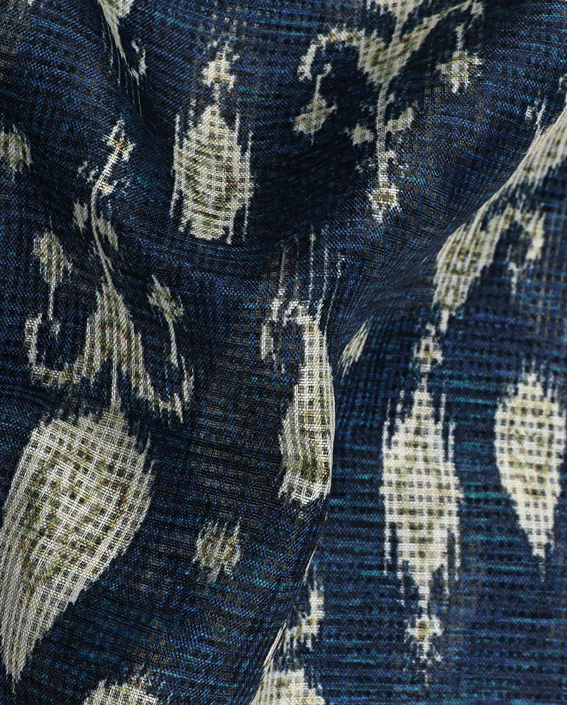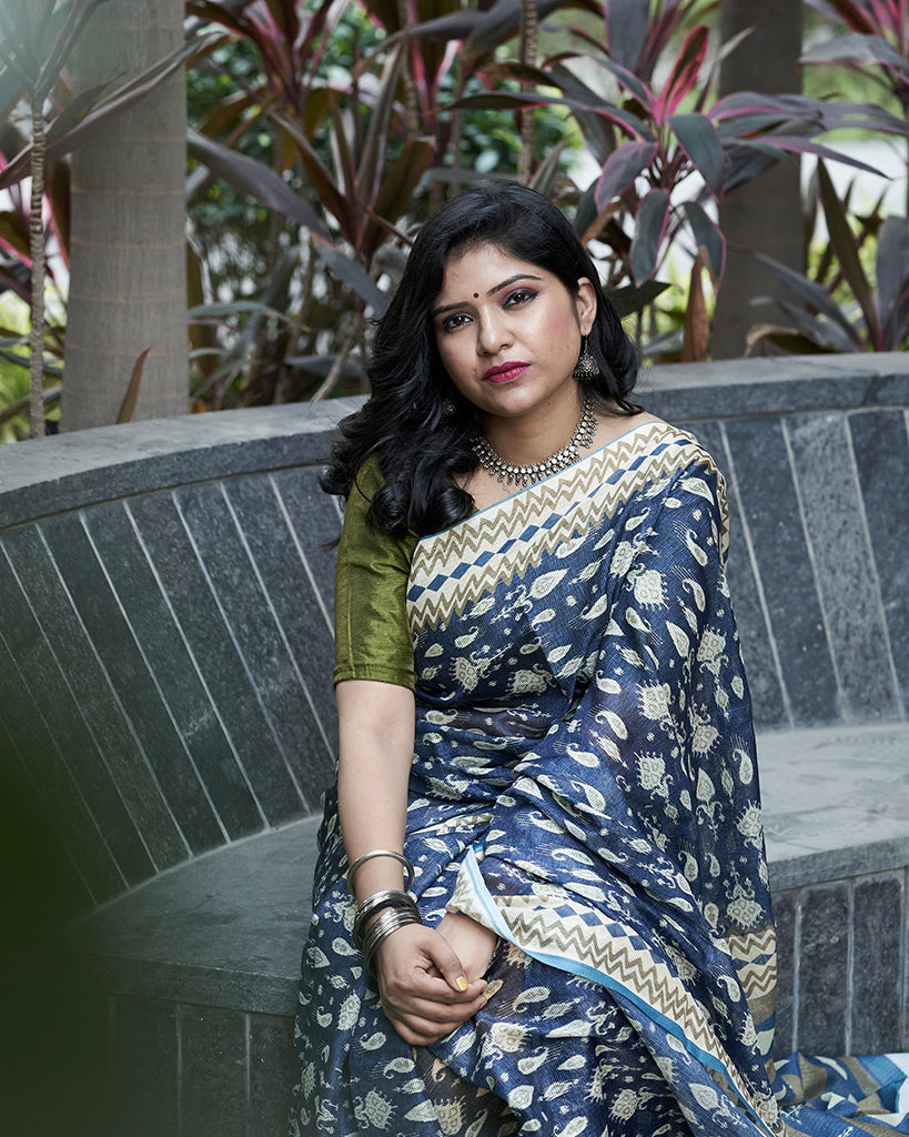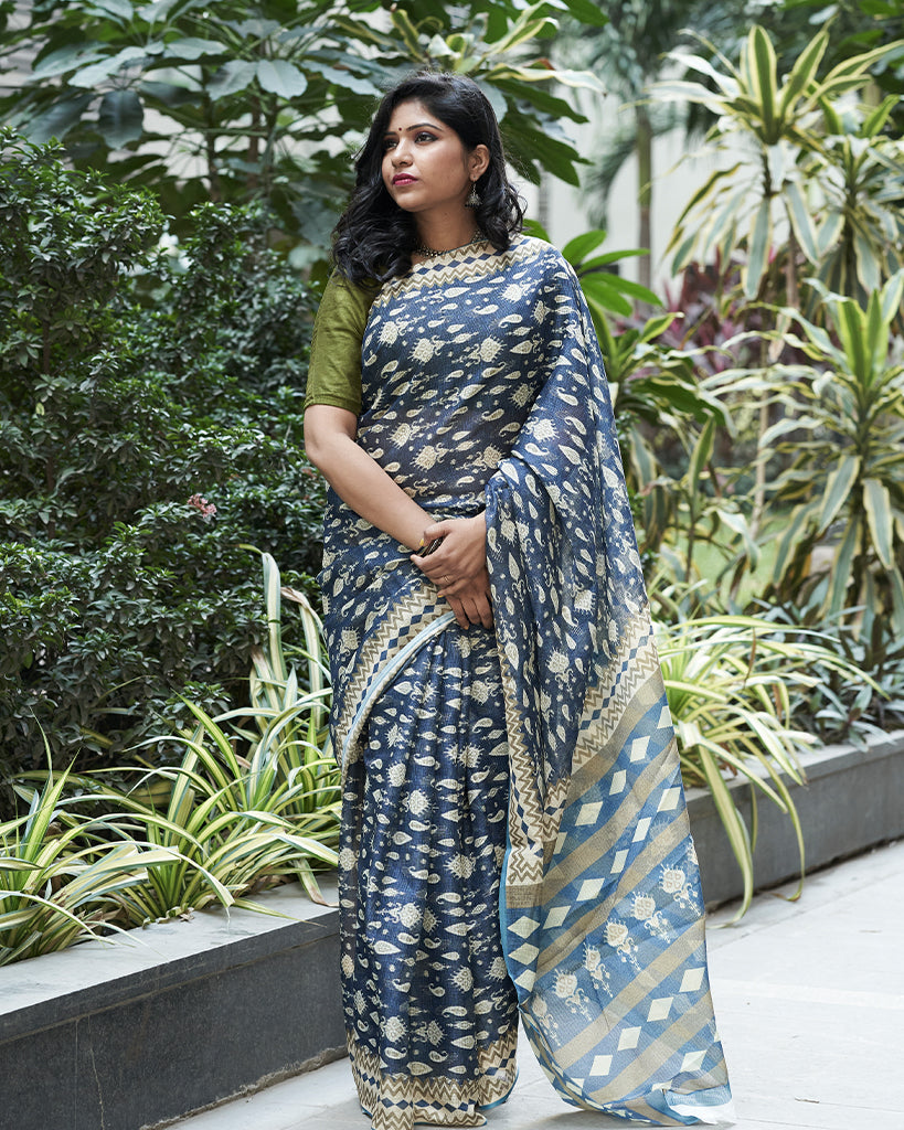 Navy Blue And Olive Traditional Pattern Digital Print Kota Checks Saree With Blouse