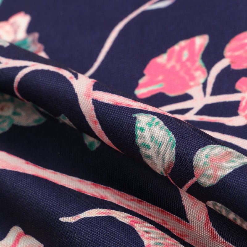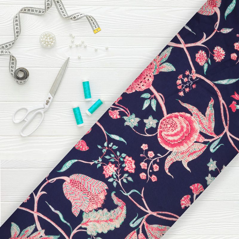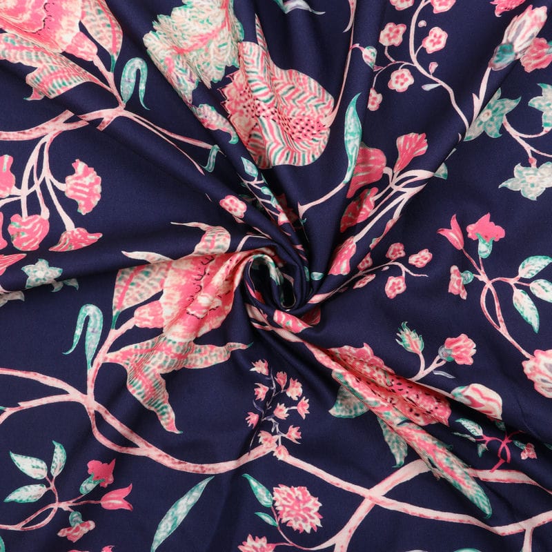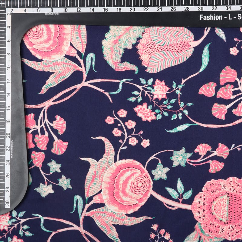 Navy Blue And Pink Floral Pattern Digital Print Rayon Fabric