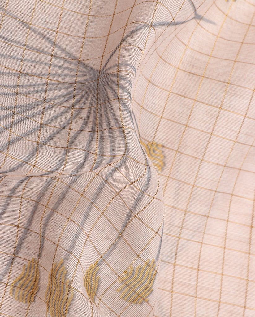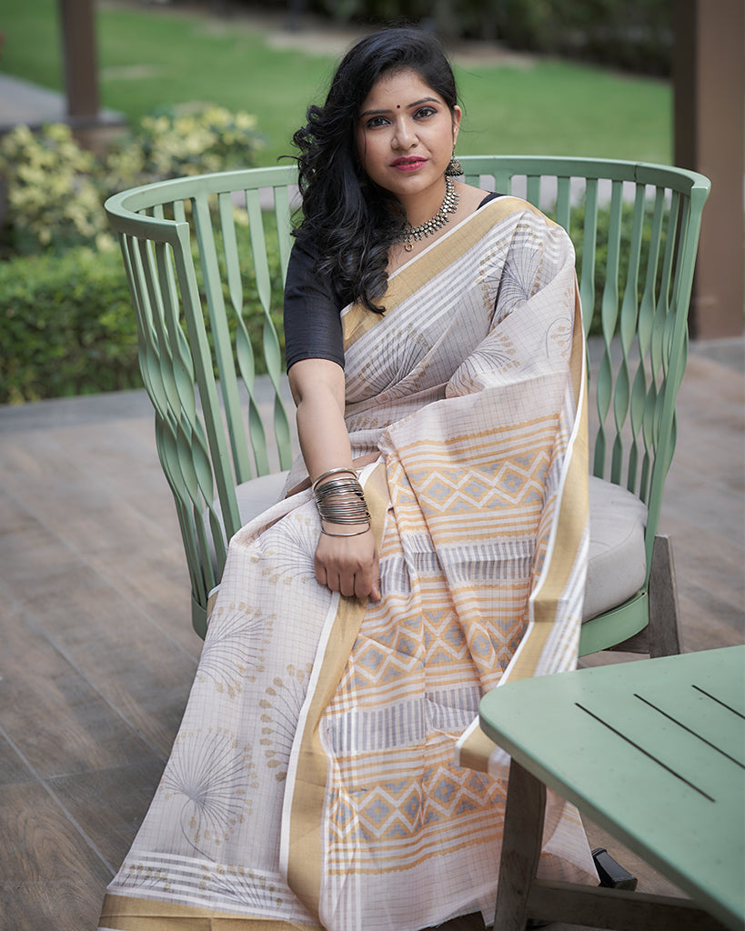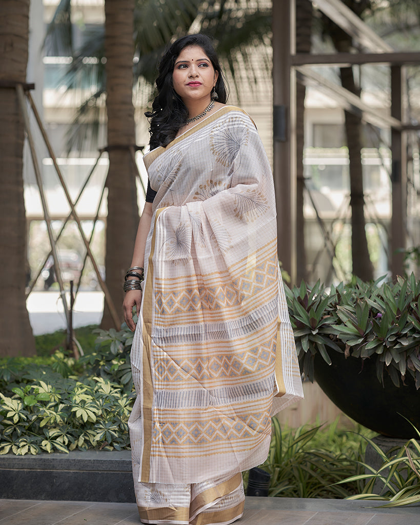 Oat Beige And Yellow Leaf Pattern Digital Print Chanderi Lurex Saree With Blouse
