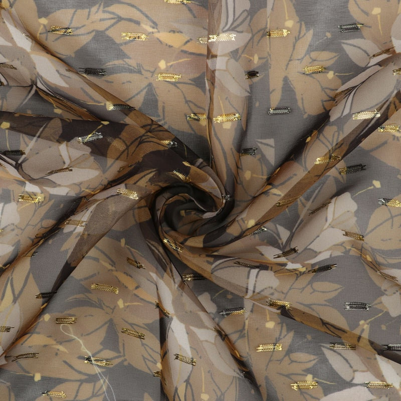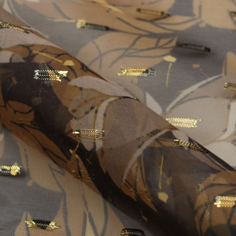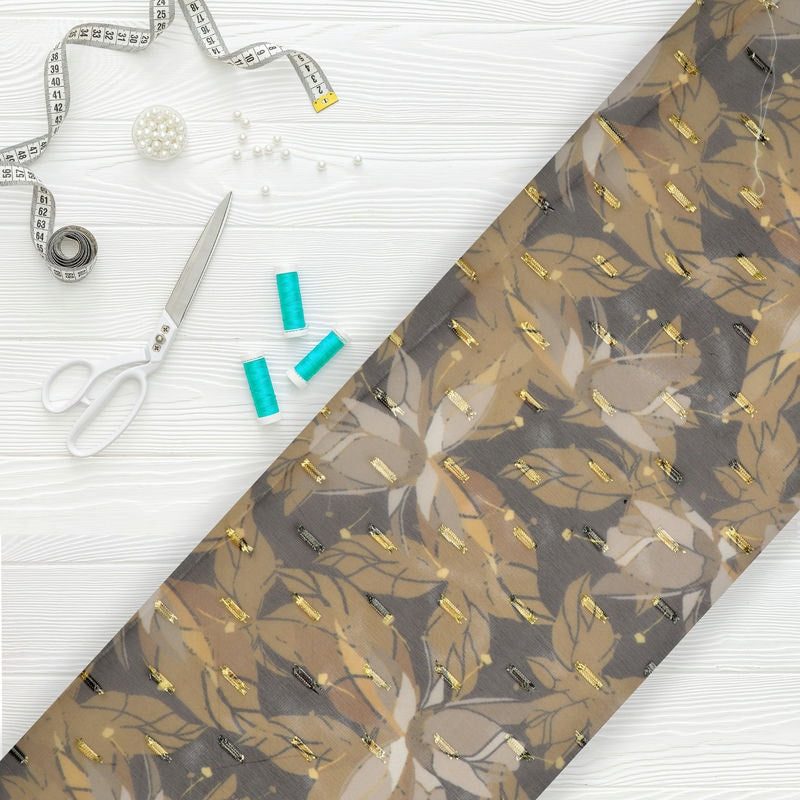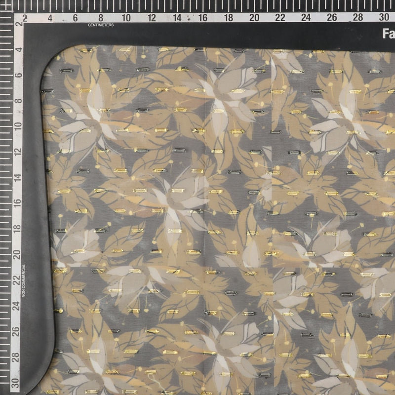 Olive Green And Off White Leaf Pattern Digital Print Chiffon With Golden Zari Dobby Fabric