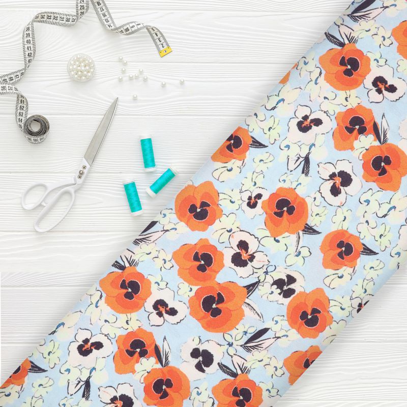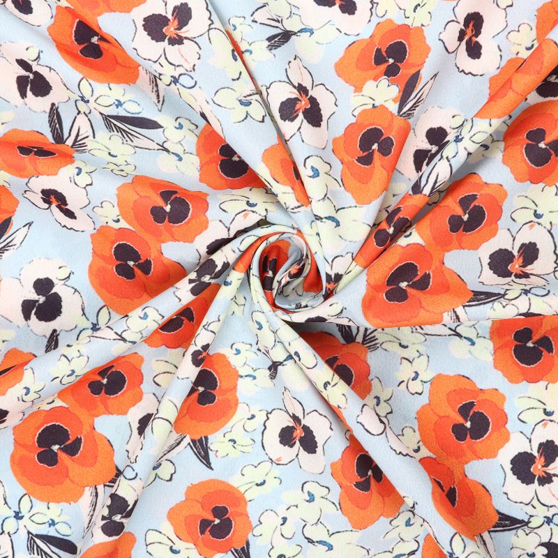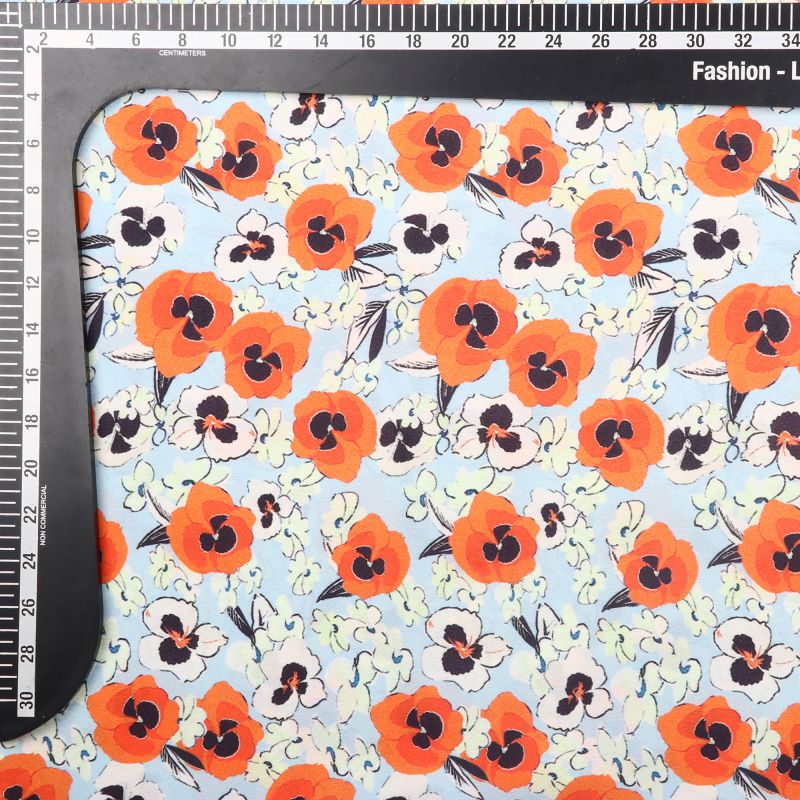 Orange And Sky Blue Floral Pattern Digital Print American Crepe Fabric