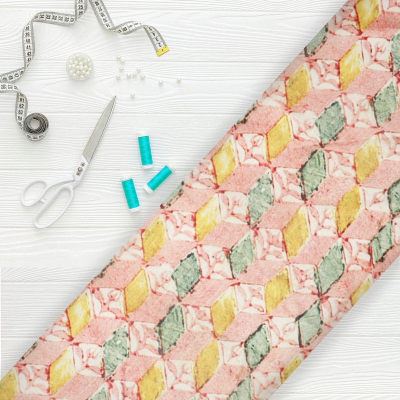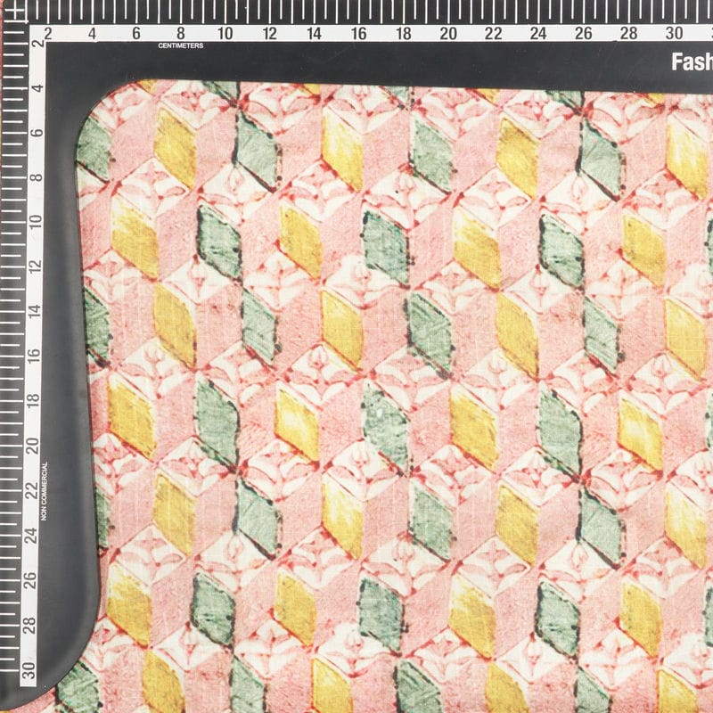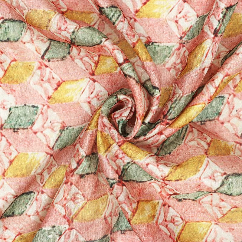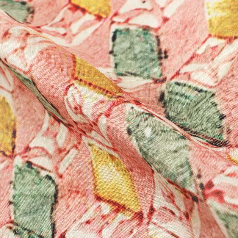 Peach And Yellow Geometric Pattern Digital Print Tangy Silk Checks Fabric