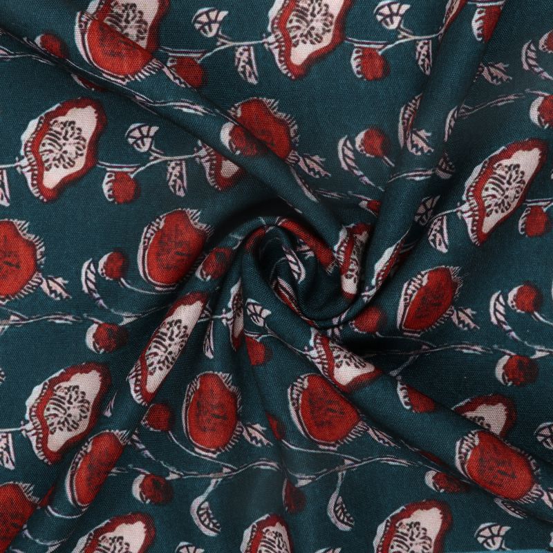 Pine Green And Dark Red Floral Pattern Digital Print Rayon Fabric