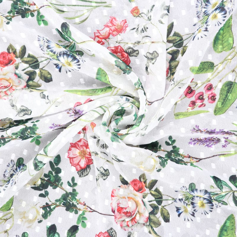 Georgette Dobby fabric is a type of polyester fabric that has a distinctive dobby weave, giving it a textured appearance. It is often printed with digital designs, which provides sharp and vibrant prints. This fabric is lightweight, durable, and easy to care for, making it a popular choice for clothing and home decor items. It has a slightly sheer appearance, drapes well, and has a soft, flowing feel.