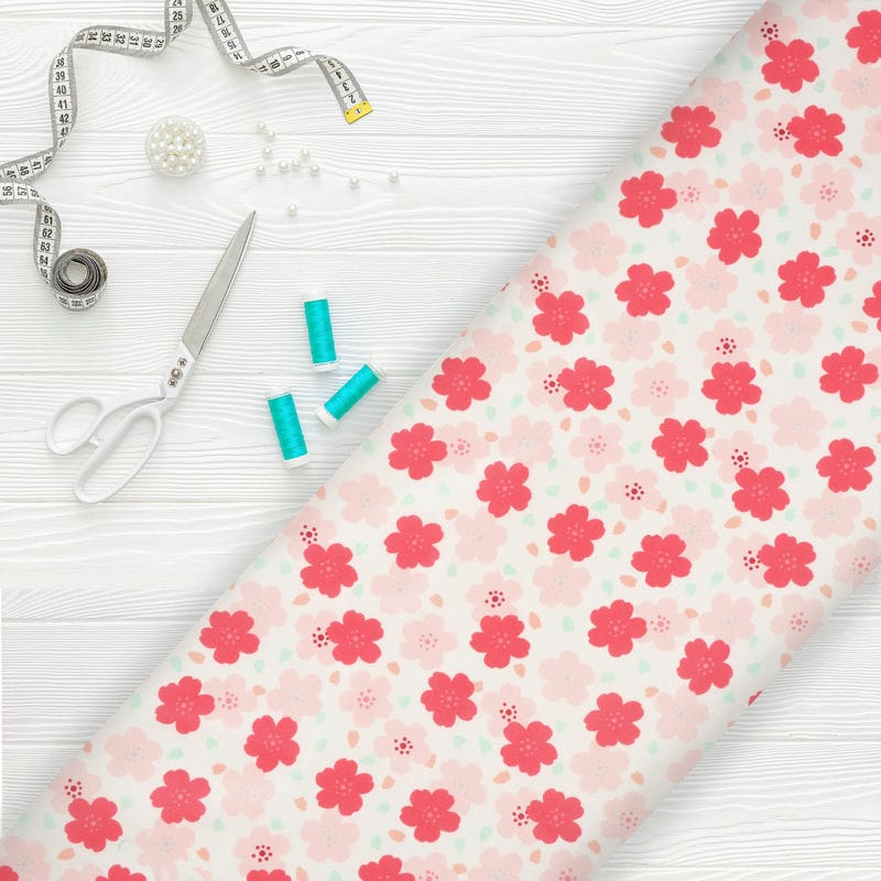 Pinkish Red And White Floral Pattern Digital Print Japan Satin Fabric