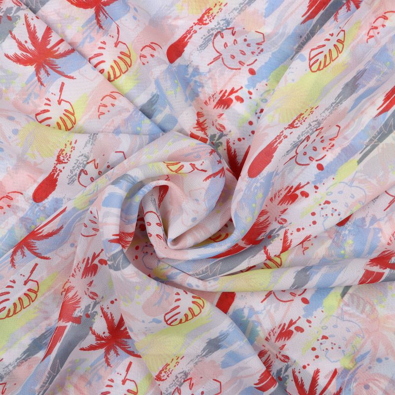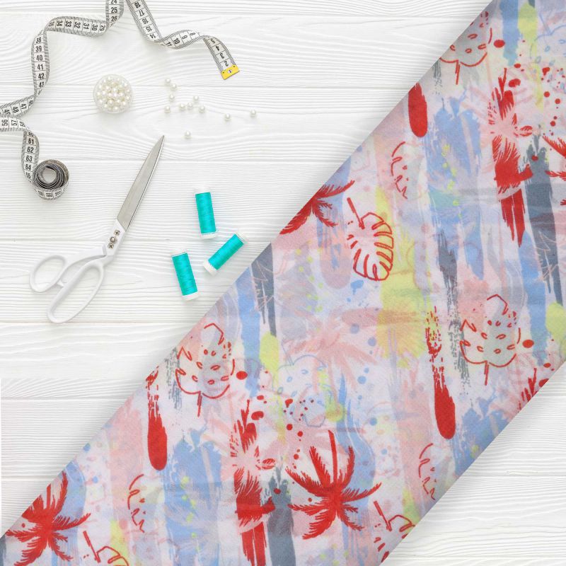 Red And Sky Blue Leaf Pattern Screen Print Georgette Fabric