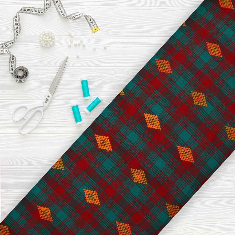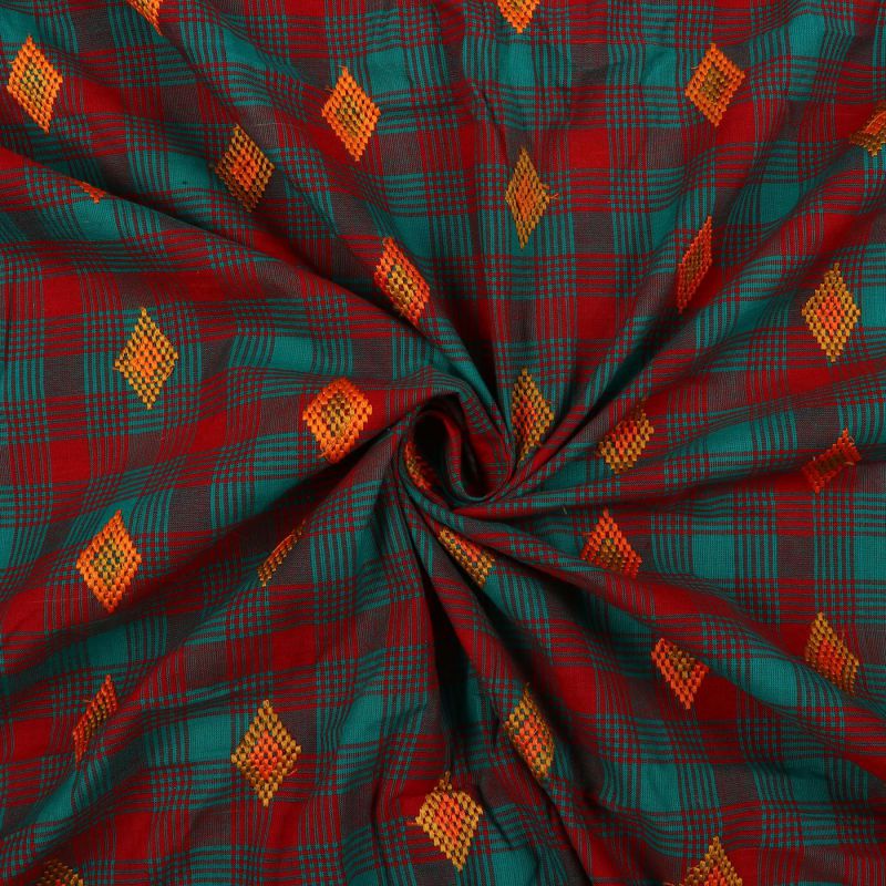 Dusty Green And Red Checks Pattern Dyed Embroidery Cotton Fabric