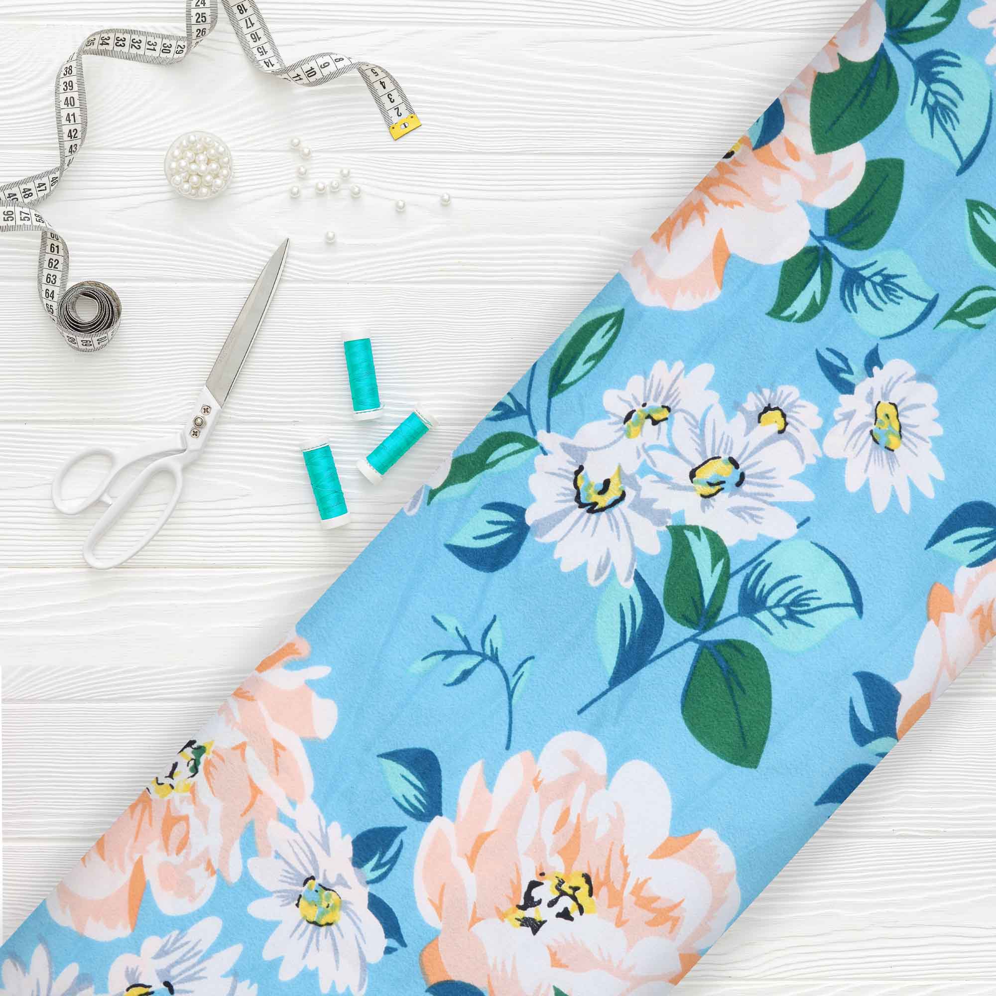 Sky Blue And Peach Floral Pattern Screen Print Crepe Fabric