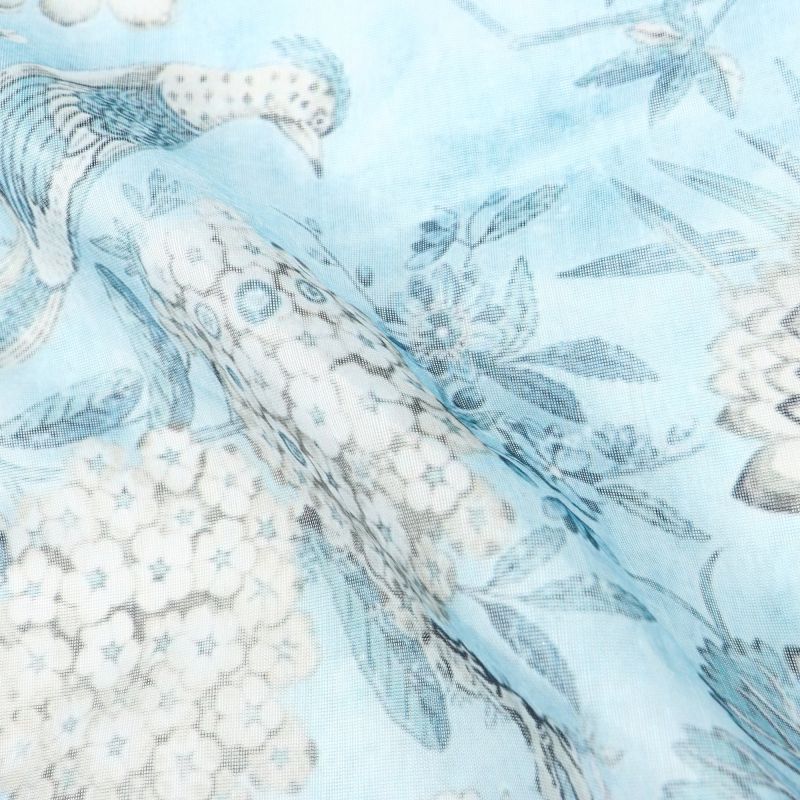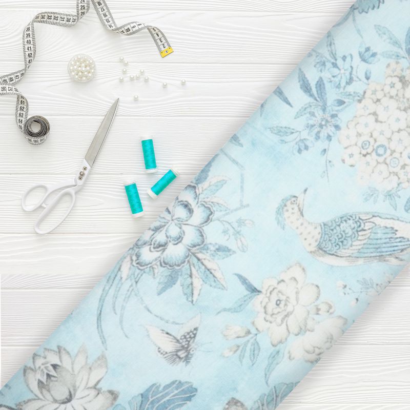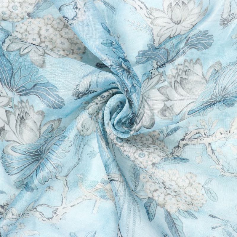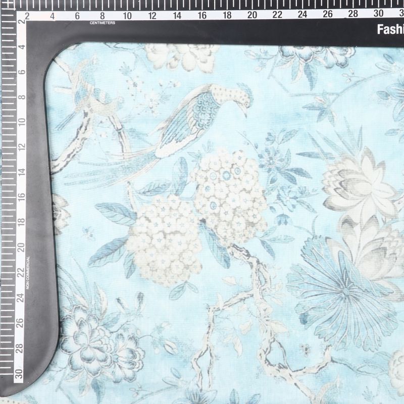 Sky Blue And White Floral Pattern Digital Print Chanderi Fabric