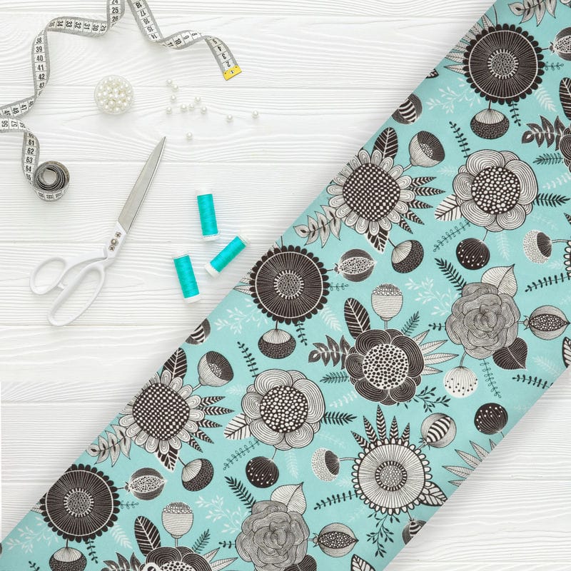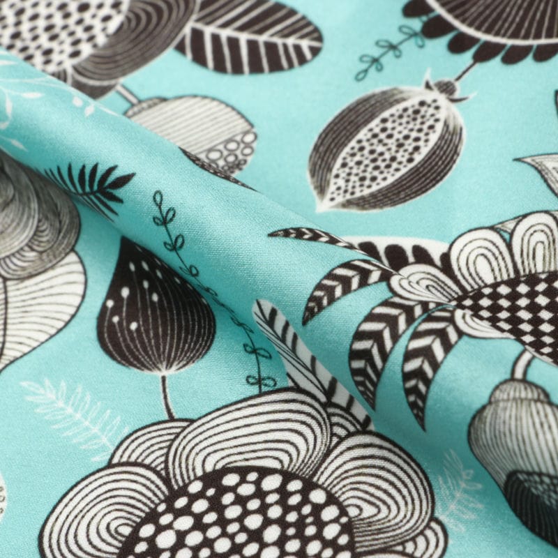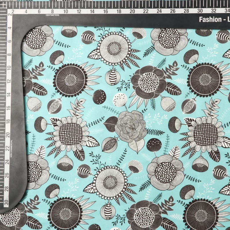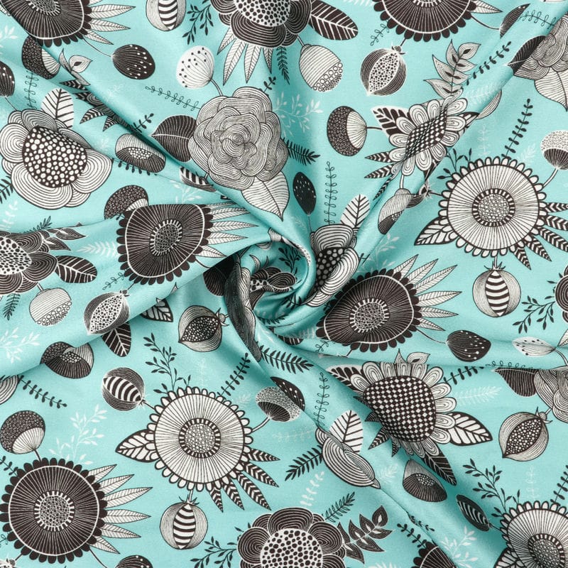 Tiffany Blue And Black Floral Pattern Digital Print Japan Satin Fabric