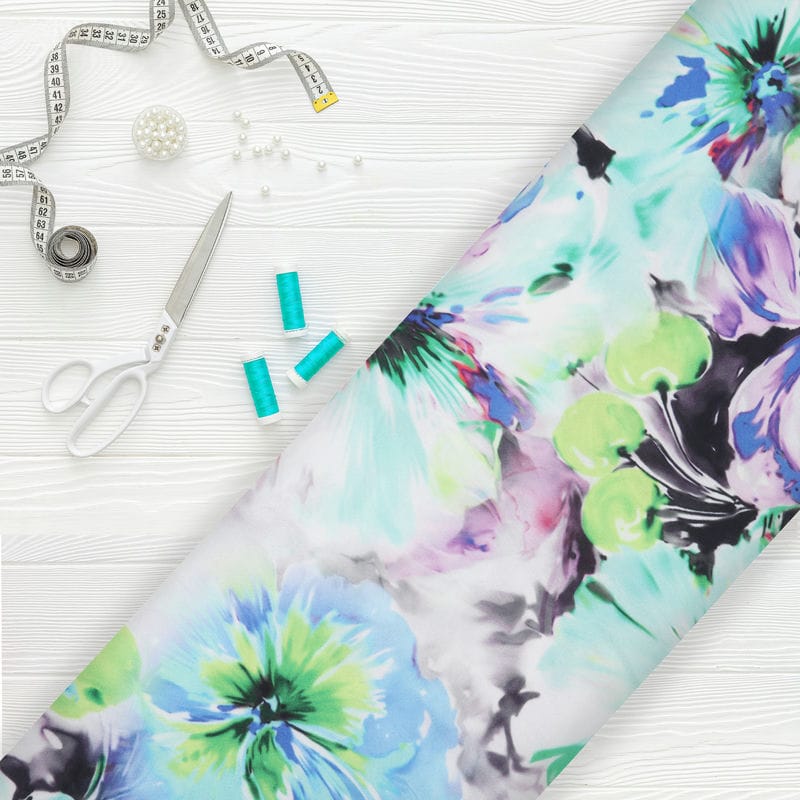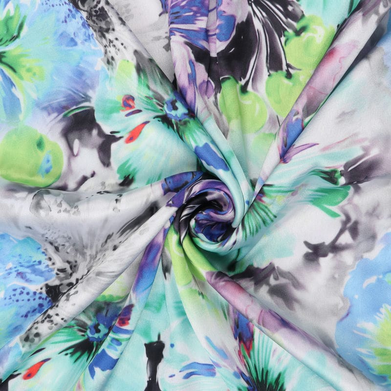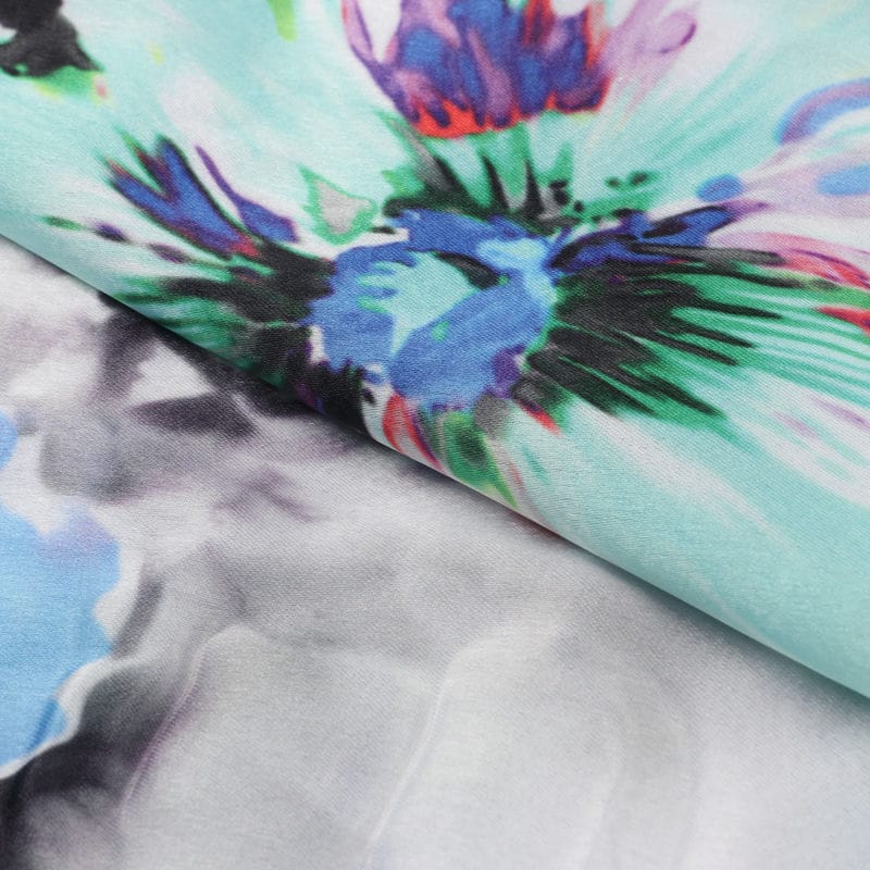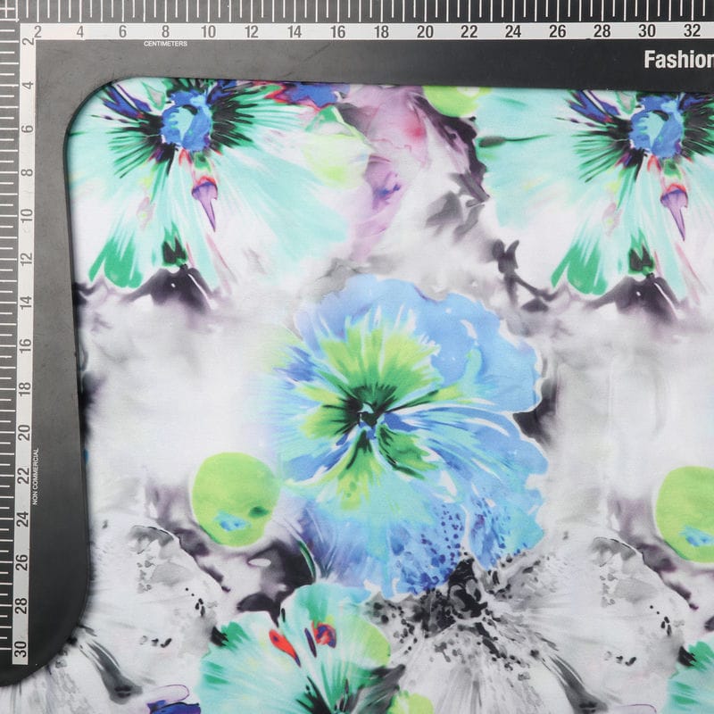 Turquoise And White Floral Pattern Digital Print Japan Satin Fabric