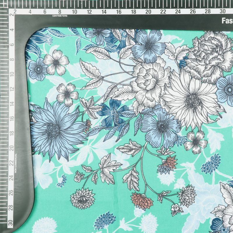 Turquoise And White Floral Pattern Digital Print Rayon Fabric