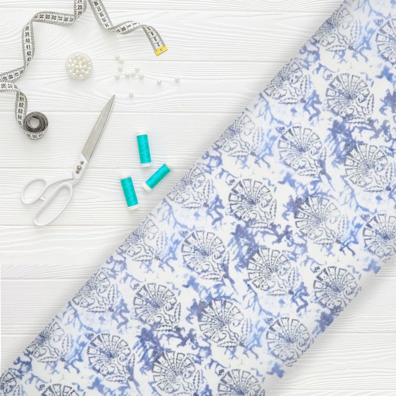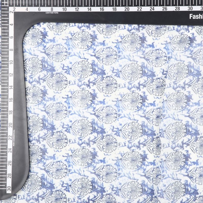 White And Blue Floral Pattern Digital Print Chanderi Fabric