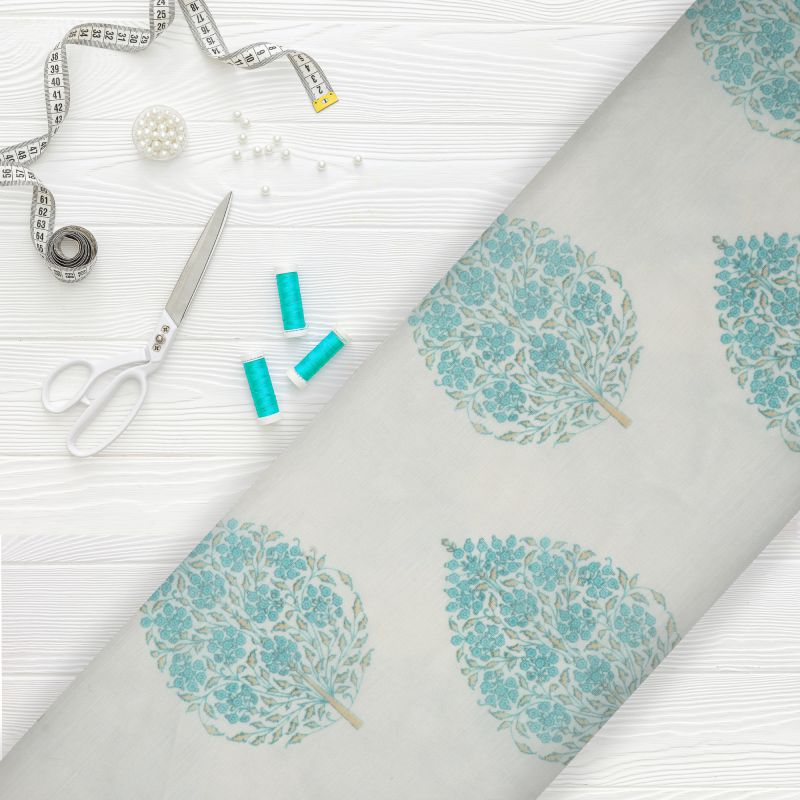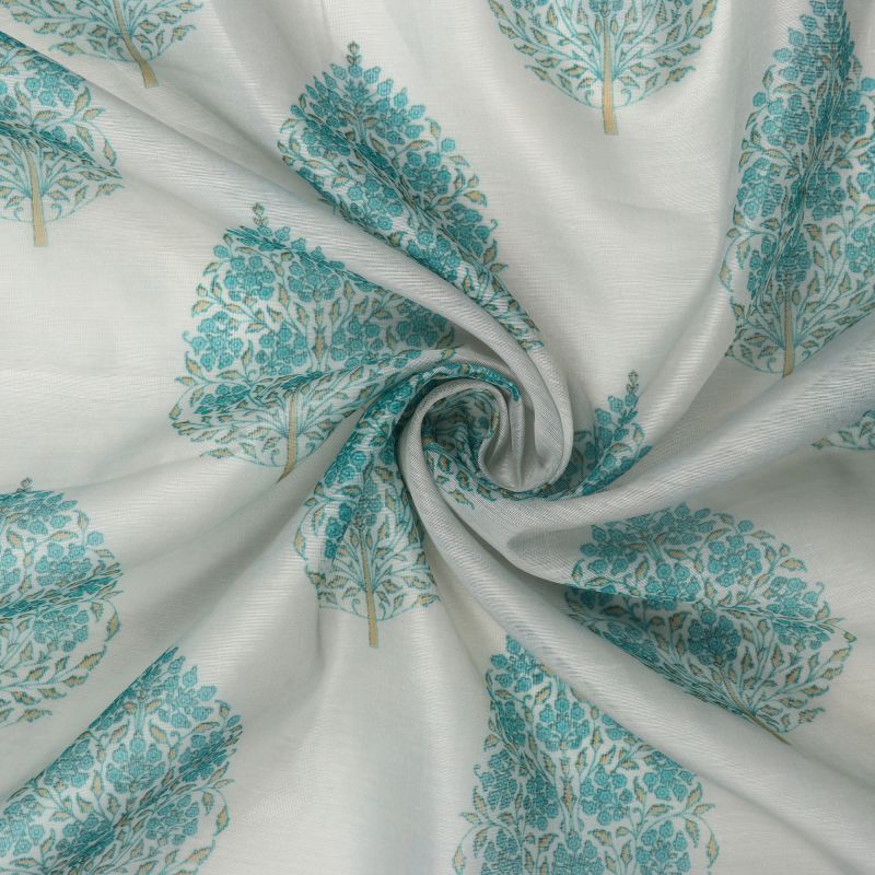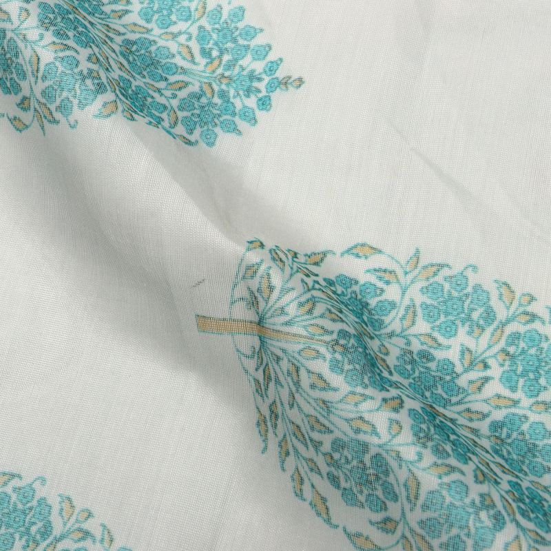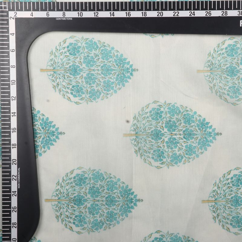 White And Ocen Green Mughal Pattern Digital Print Chanderi Fabric