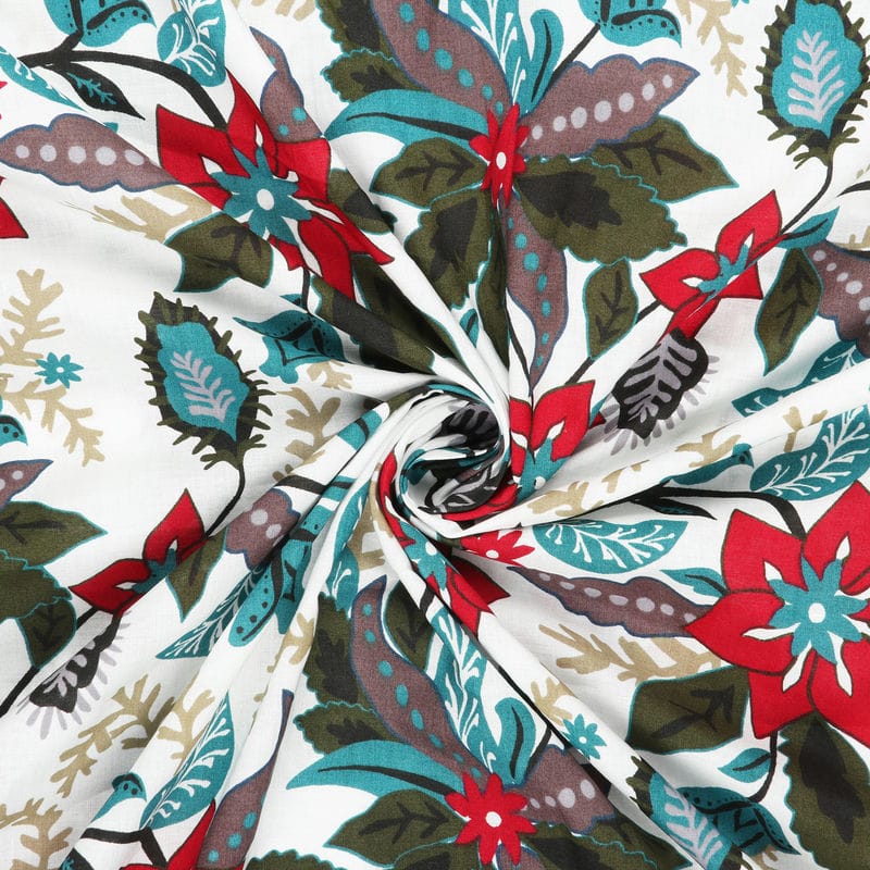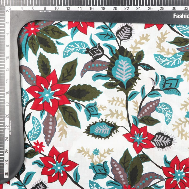 White And Red Floral Pattern Screen Print Cotton Fabric