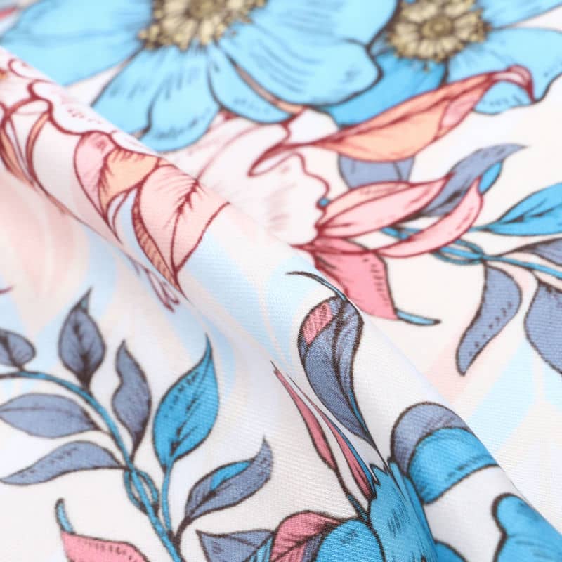 White And Sky Blue Floral Pattern Digital Print Rayon Fabric