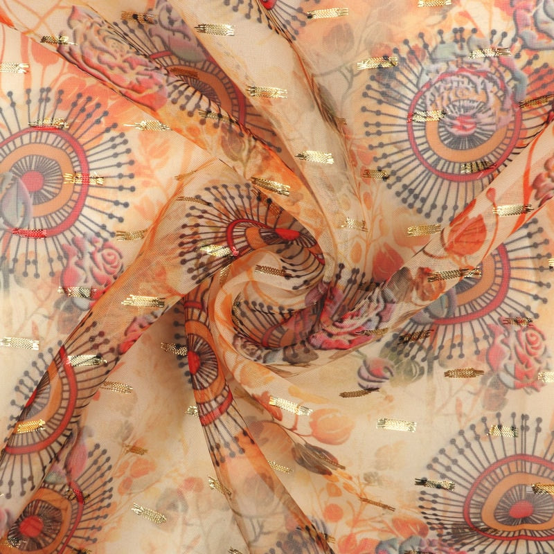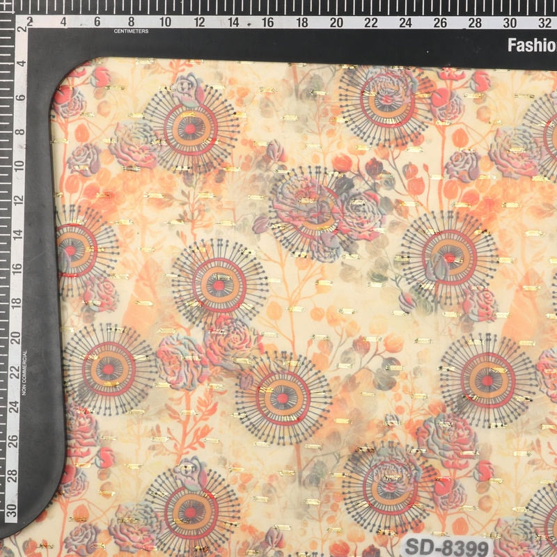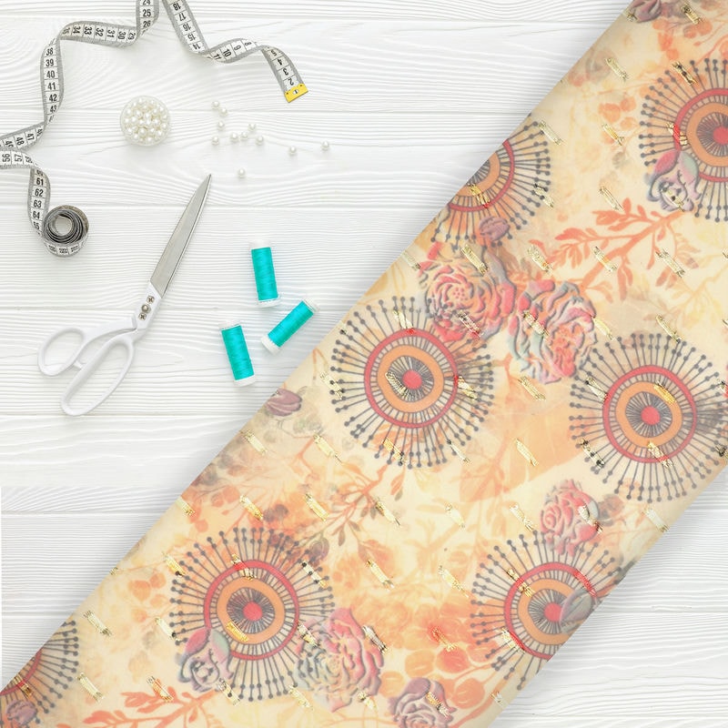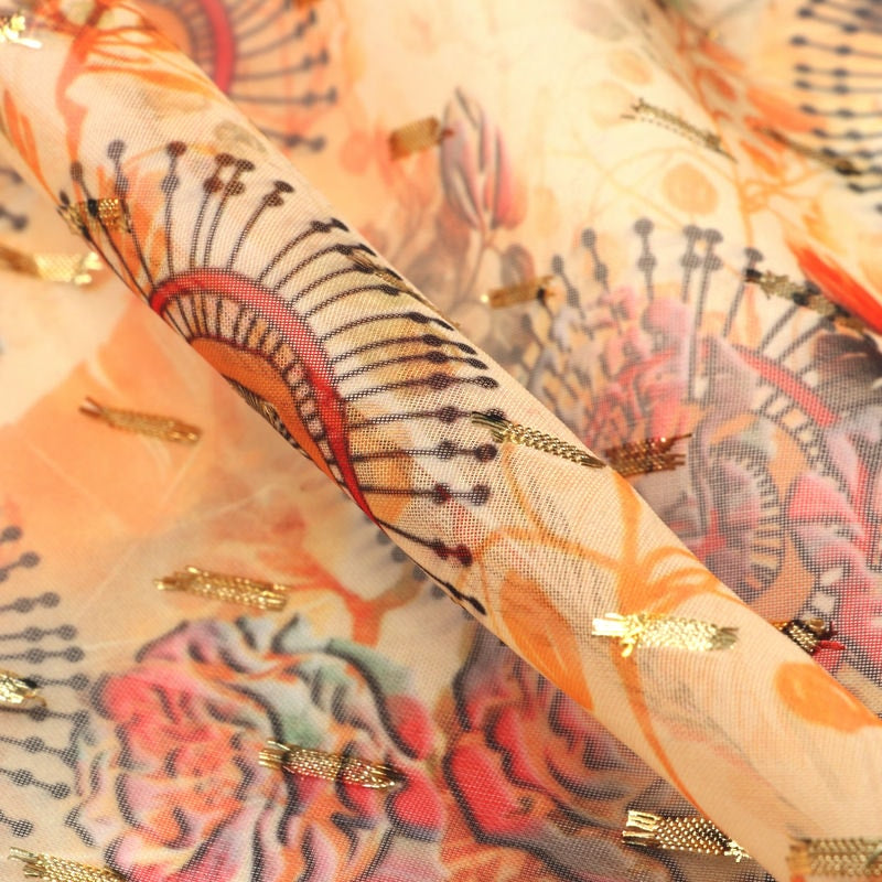Yellow And Red Floral Pattern Digital Print Chiffon With Golden Zari Dobby Fabric
